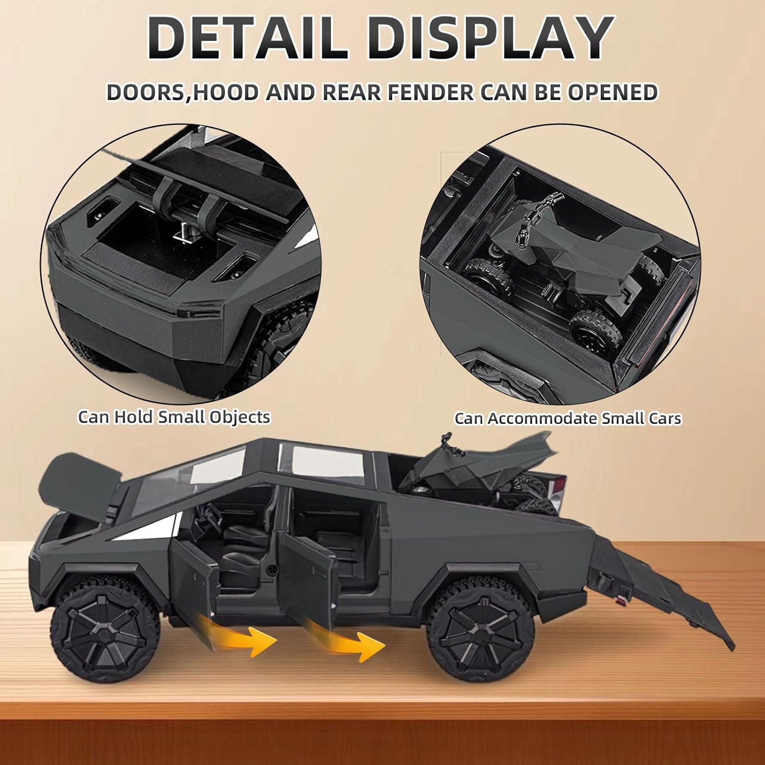 Premium Materials for Durability and Safety:Crafted from high-quality diecast metal alloy and superior ABS material, our cybertruck toy is robust and long-lasting. The sturdy body and safe interior decorations make it ideal for children's entertainment. Certified by CPC and CPSIA after passing rigorous quality tests, it ensures worry-free play for kids