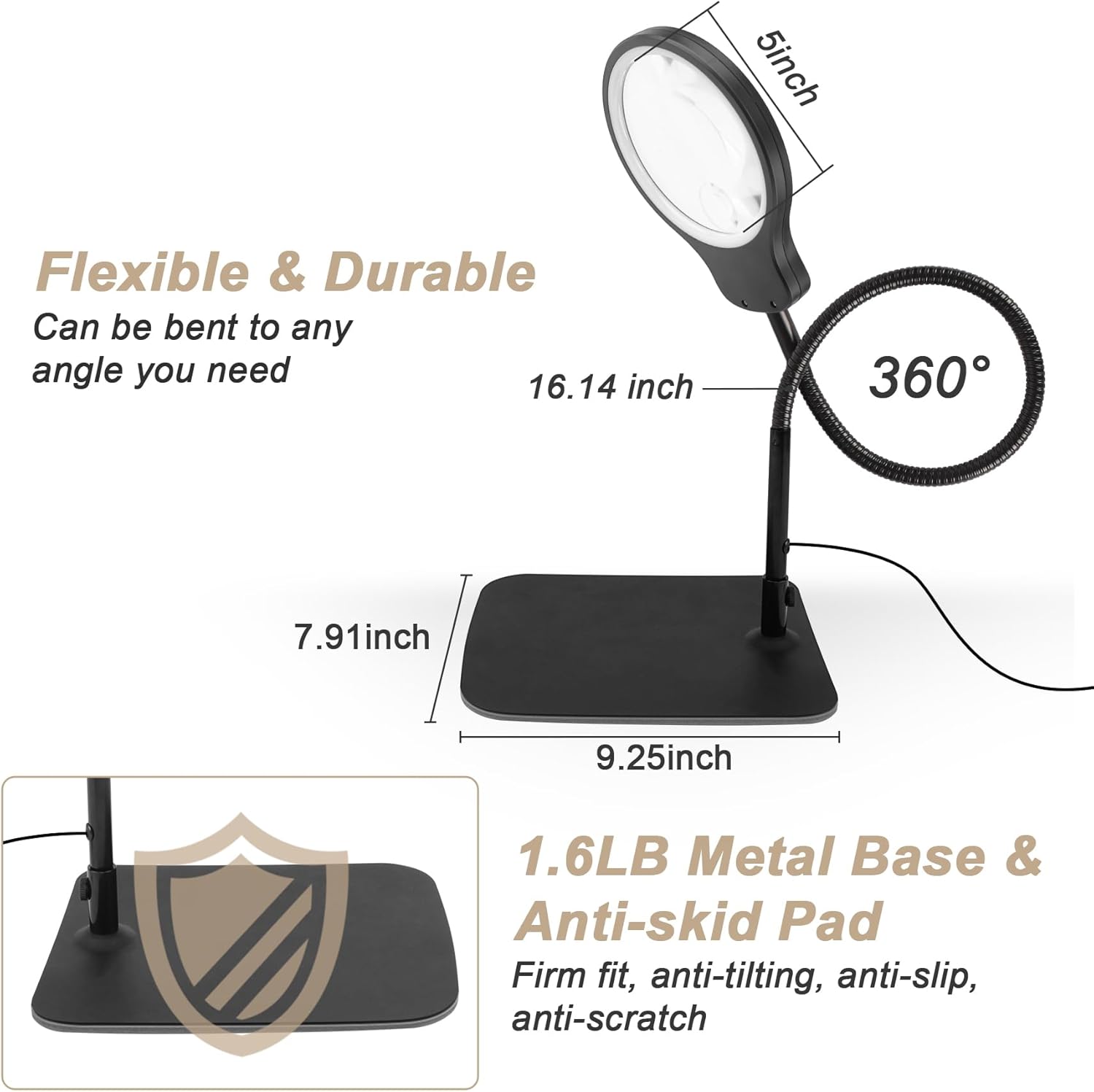 The desktop magnifier with light and stand is powered by the included USB cable and comes with an adapter.