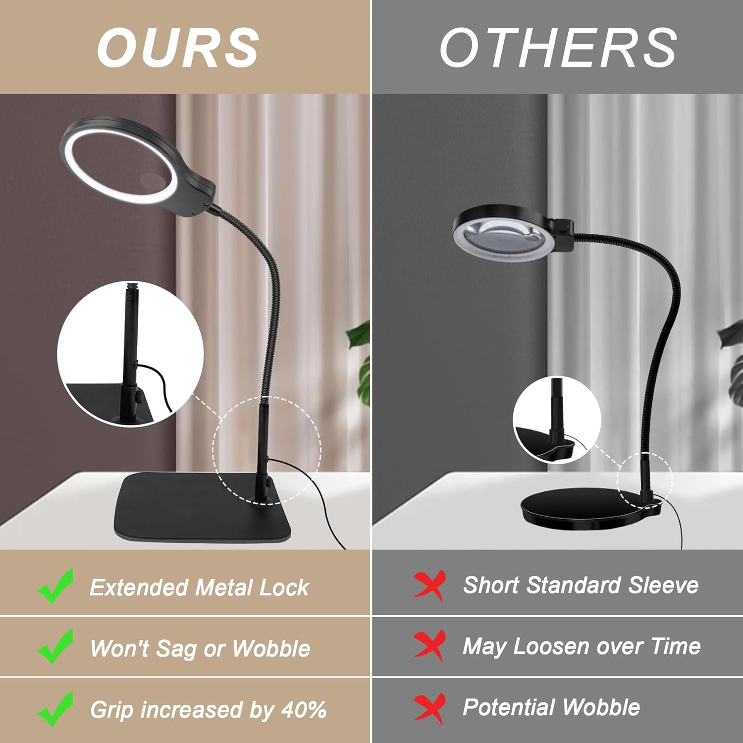 Review: Received the lamp boxed well and delivered on time. I opened box and proceeded to put lamp together. The base is weighted and stay put with non scratch bottom. The lamp part has a large magnifying glass with a quarter size 30x magnifying window in the 10x glass. The arm is bendable metal snake that screws into base. I set it all up then plugged the cord with usb end into the usb wall plug and plugged into outlet. Pushed the power button- nothing? Changed outs-nothing? Removed usb wall plug and plugged the USB directly into power strip with usb port-lights up! Conclusion usb wall port defective. Pulled out a new wall plug from my electronics bag and plugged usb in my wall plug and then into outlet- lights up!So pros: everything worksCons: USB Wall plug defective