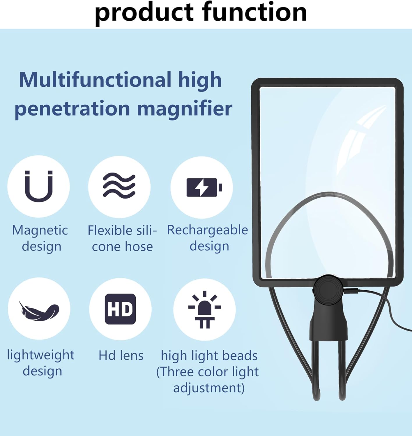B0FRZJLSSJ, Experience effortless clarity with our upgraded 10X hands-free magnifying glass, designed for seniors, hobbyists, and low-vision users. Featuring a large 10.1″ x 7.4″ optical-grade lens and 50 energy-efficient LED lights with adjustable brightness, this magnifier delivers distortion-free magnification and optimal illumination for reading, crafting, and detailed work. Its rechargeable USB-C battery eliminates the need for disposable batteries, while the flexible gooseneck and neck-wear design ensure hands-free convenience. Whether for books, embroidery, or repairs, this versatile tool…, 5,