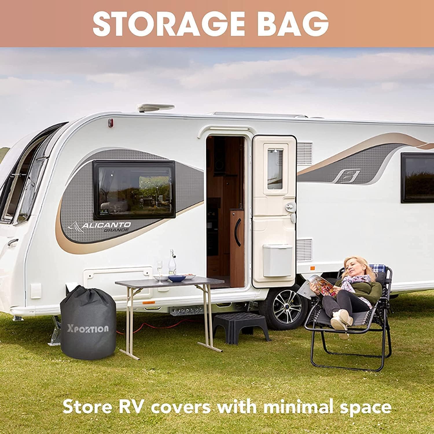 New Upgraded Design: The travel trailer RV cover features a new aluminum film composite cotton material that reflects strong light, offers excellent UV protection, and provides heat insulation to keep your RV cool. Constructed with four-layer high-strength, high-density non-woven fabric, it boasts strong waterproof performance. This enhances the usability and anti-aging performance of the RV cover, camper cover, trailer cover, and travel trailer cover.