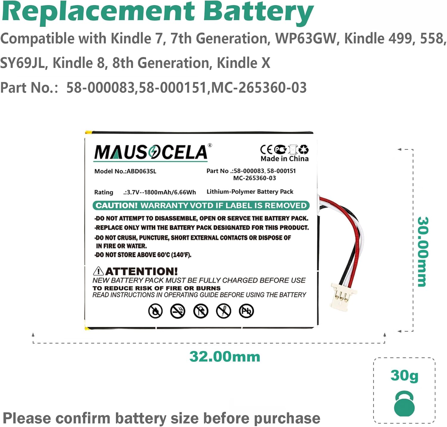 COMPATIBLE MODEL: Battery for Kindle 499, 558, 7, 7th Generation, Kindle 8, 8th Generation, Kindle X, SY69JL, WP63GW