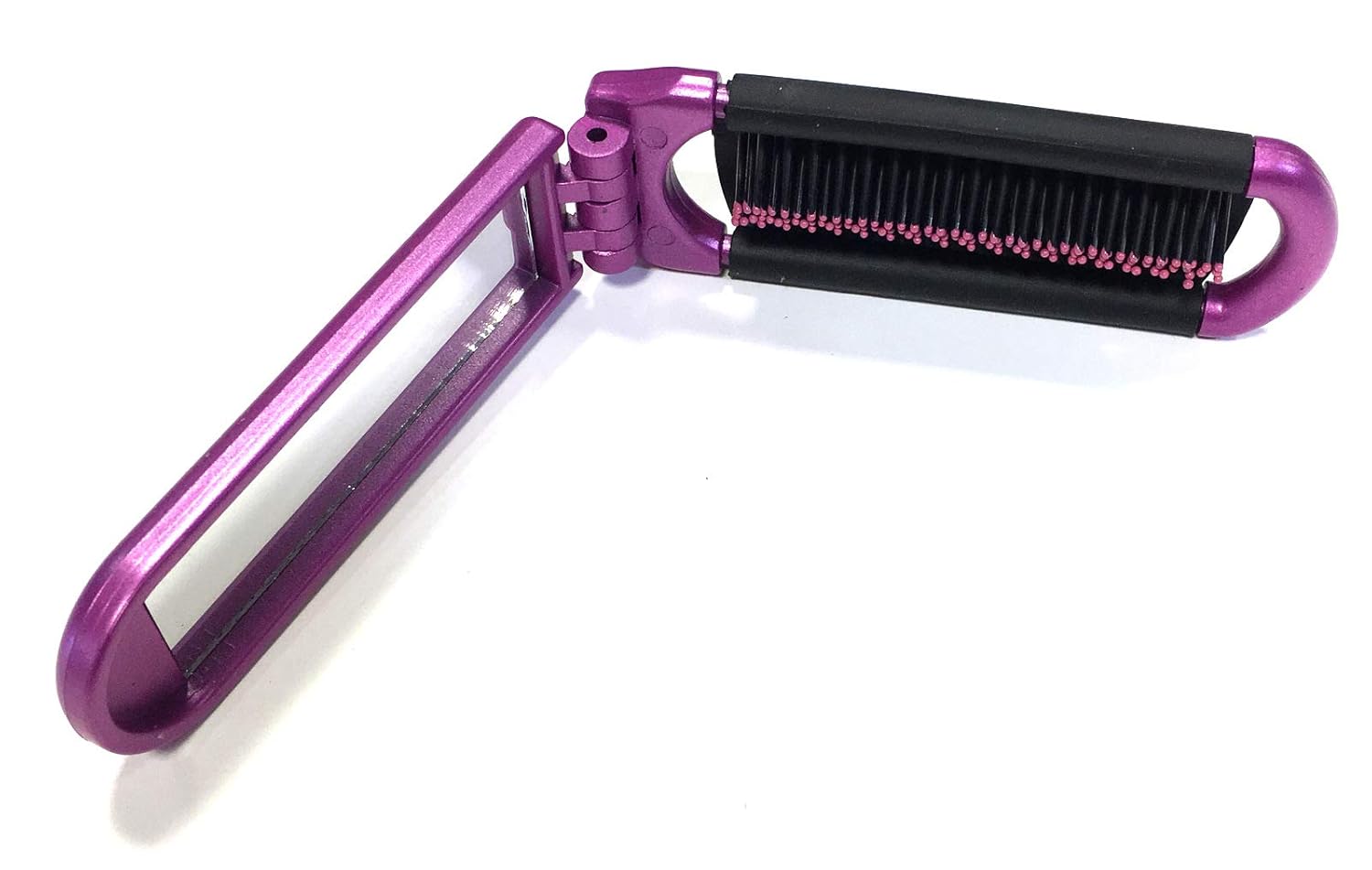 Folding Hair Brush With Mirror Compact Pocket Size 8" when opened, 4" When folded - 2.5" Mirror inside the handle