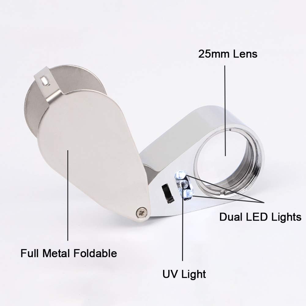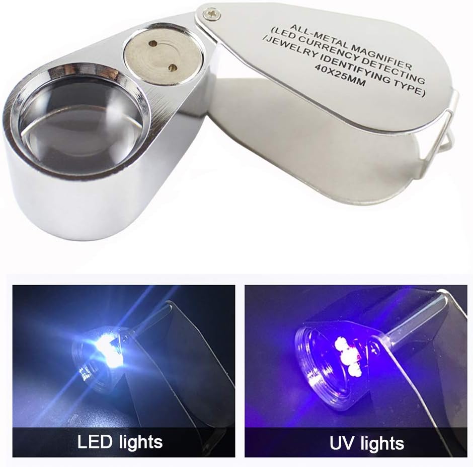 Review: These 40X Metal Illuminated Jewelry Loop Magnifiers are very good. I used them when I go metal detecting to be able to see the dates on the coins I find