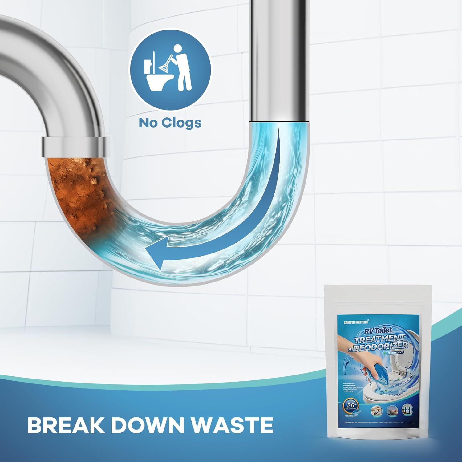 ODOR CONTROL: Our RV toilet treatments effectively eliminate unpleasant odors, ensuring a fresh and pleasant bathroom environment during your travels. Keep your RV’s black tank clean and odor-free.