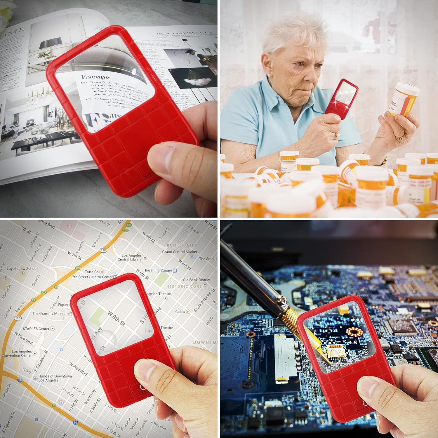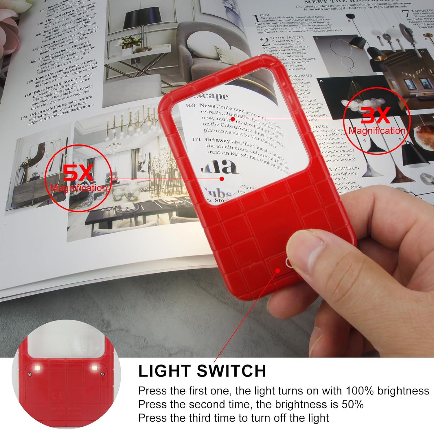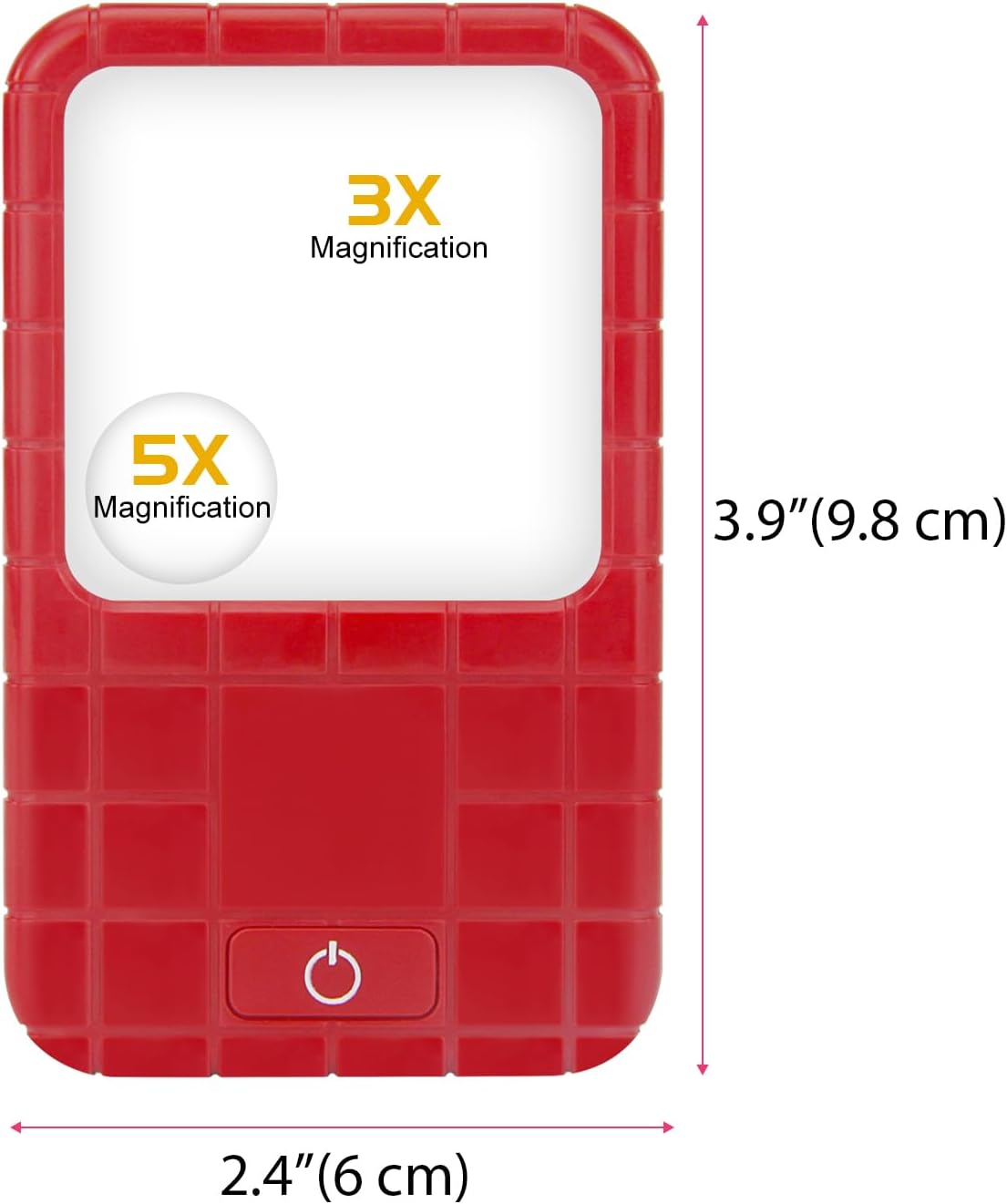 Review: This is a nice lighted 3X and 5X magnifier. Batteries are also included. These batteries can be replaced too. It has a very clear lens and I like the red color and the design. It is a good bargain, as you get a quantity of three. These would make great gifts too.