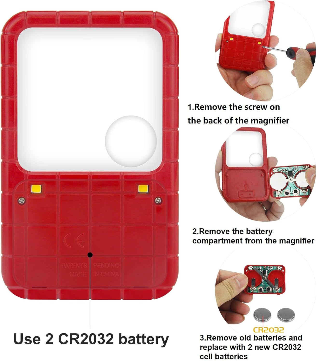 Review: These magnifiers work very well. Best of the ones at this price range.Unfortunately, they come with teeny tiny screws that have to be loosened to remove the plastic strip blocking the battery. It does include one tiny screwdriver which is easily lost. The screws are even more easily lost, and if you need a magnifier in the first place, doubtful if you could keep track of the screws and get them back in after a battery change.I plan to buy new ones instead of chasing screws.