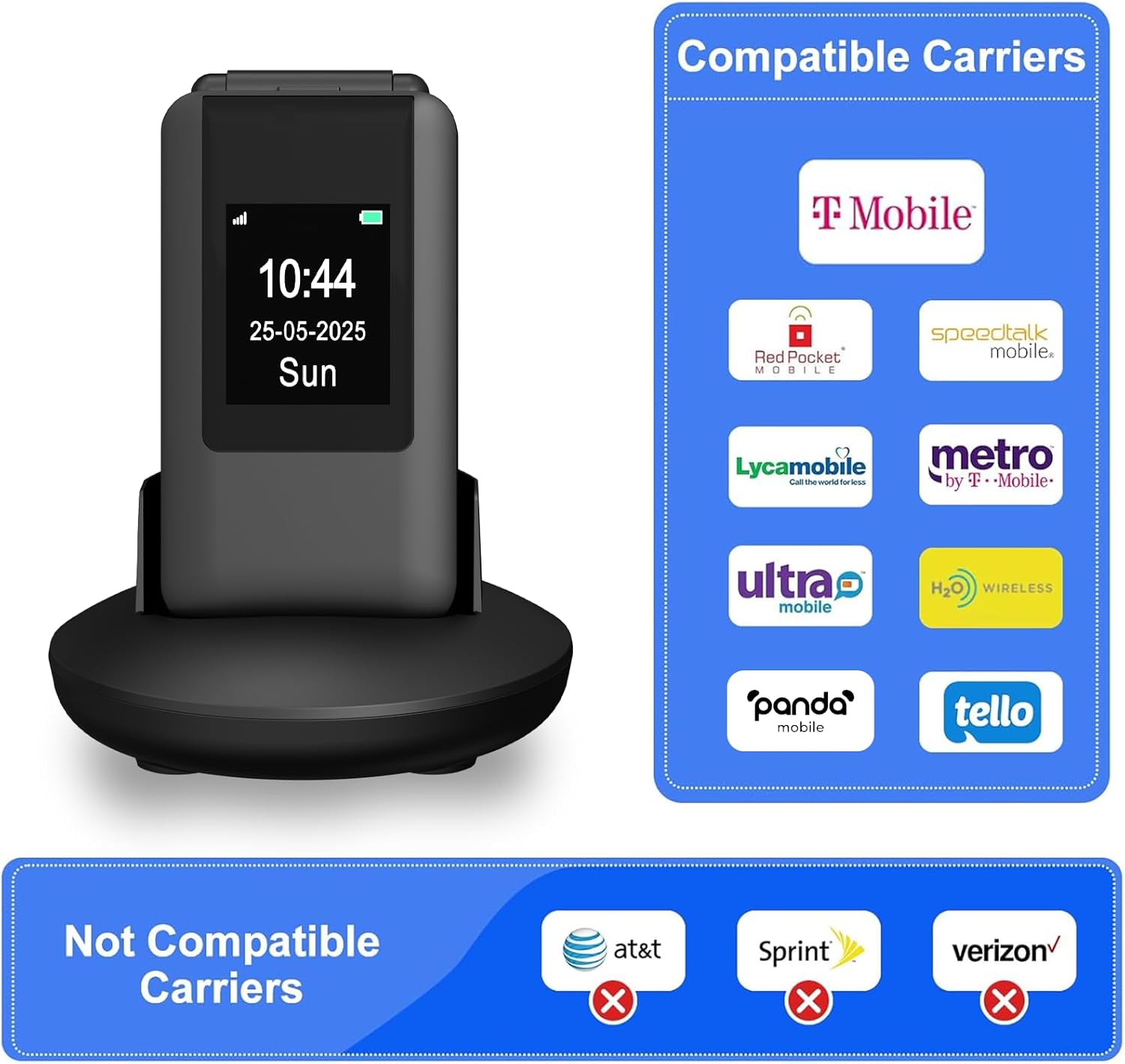 Review: “This flip phone is an excellent choice if you want something simple,reliable,and affordable.It offers all the essential features without the distractions that come with smartphones.The 1.44-inch external display clearly shows incoming calls and notifications at a glance,while the larger internal screen is sharp and bright.The keypad is responsive and easy to use,making dialing calls and sending text messages a breeze.Great Features for the Money:It supports 4G LTE and even has Bluetooth connectivity. The expandable storage(up to 32GB via an SD card) is perfect for storing photos and contact information.Reliable Battery and Call Quality: The battery life is strong, easily lasting a full day with moderate use.Incoming calls are loud and clear,and the speaker quality is good,suitable for hands-free conversations.Affordable Price. Drawback:It doesn’t seem to support AT&T,but that wasn’t important to me.In conclusion,this is an outstanding flip phone that strikes a balance between simplicity and modern essential features.It’s ideal for minimalists, seniors,or anyone who wants a backup phone without the extra distractions.”