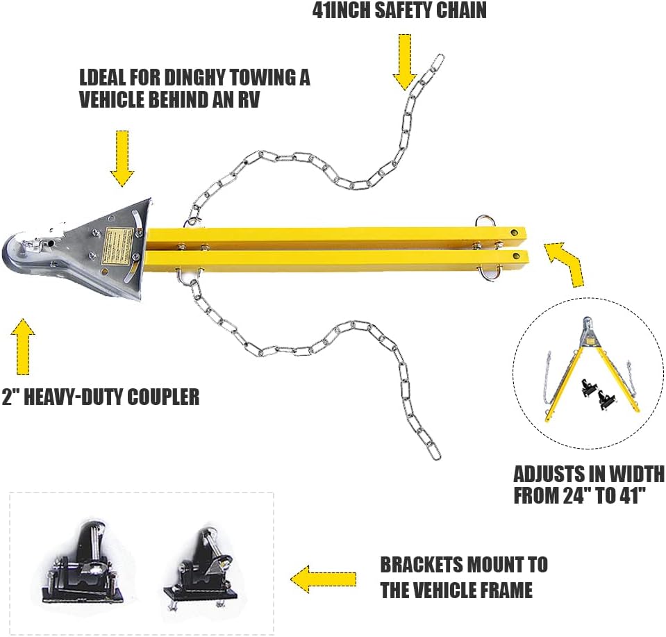 Flexibility: Heavy duty Coupler A frame coupler fits 2" Hitch ball; Arms extend from 24" to 41" adjustable