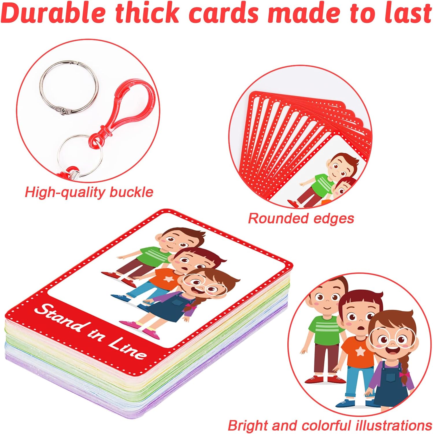 Review: Purchased the cards for my 6 year old to use in class. The cards are great. They’re made good and the pictures are simple yet they get the right meaning out. They do start to wrinkle and peel after being handled roughly and flipped around on the ring constantly. Threw mine out after 2 months because he started to chew and rip them apart.