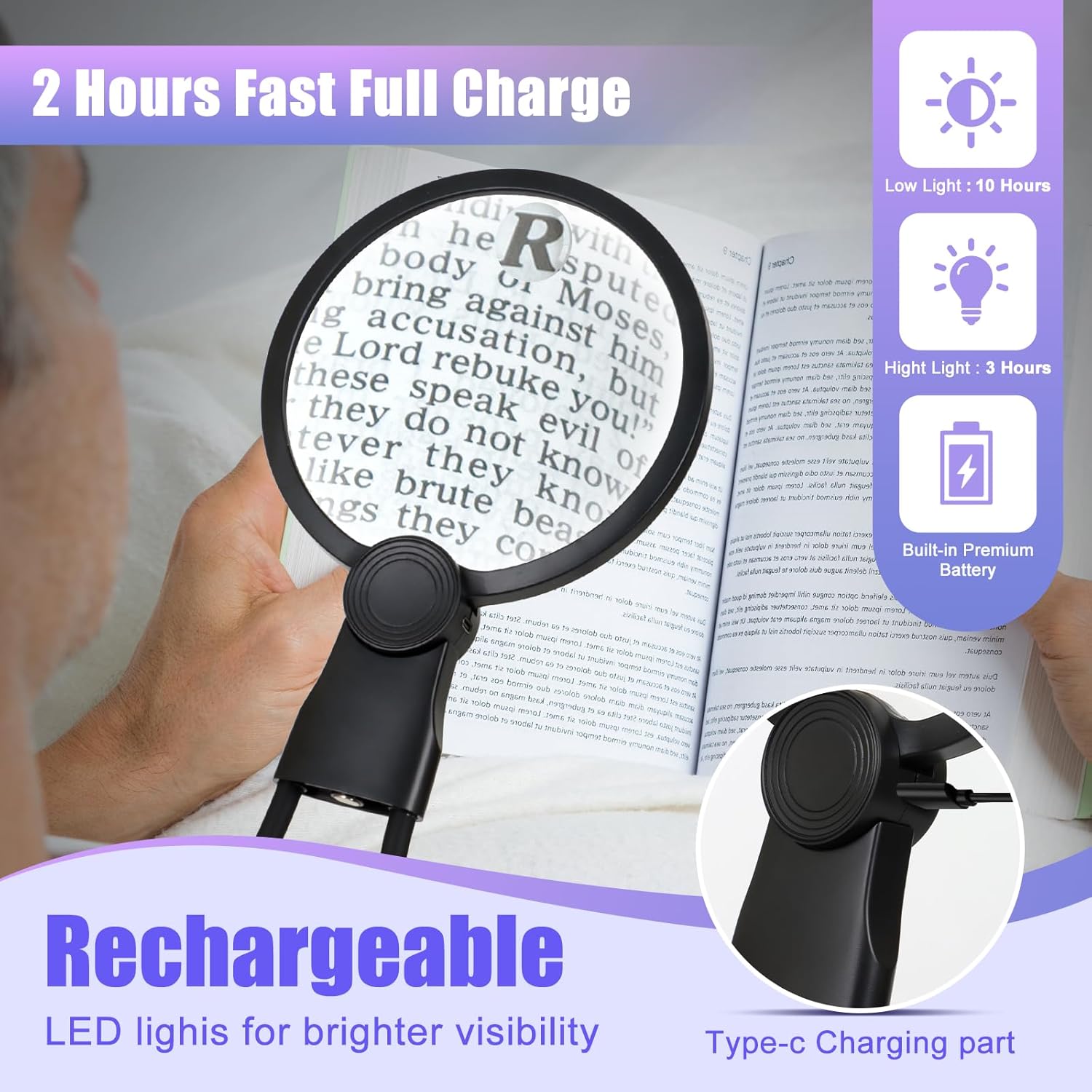Review: I’m not just saying this magnifying glass works both as a hand held or as a hands-free tool, but also the magnification works no matter which side you’re looking thru. No need to flip to see which side is the correct side to use. This magnifier is unique and has the convex curve on both sides of the glass. Of course, the rechargeable 3 color adjustable lights are great, and the comfortably flexible shoulder mount creatively works as a table stand as well. But when grabbing for 5x or even 15x enlargement to read those dang user manuals enclosed with way too many products these days, no time is wasted fumbling to get to the small print. Brilliant! One item to note: the 15x magnification point (literally, it’s that small; so maybe you catch a letter or two in its scope) is located at the opposite end of the handle, not at the bottom as shown in the product photos. When using the mount and wanting that 15x boost, some maneuvering will be necessary. Still a very useful find and well worth it.