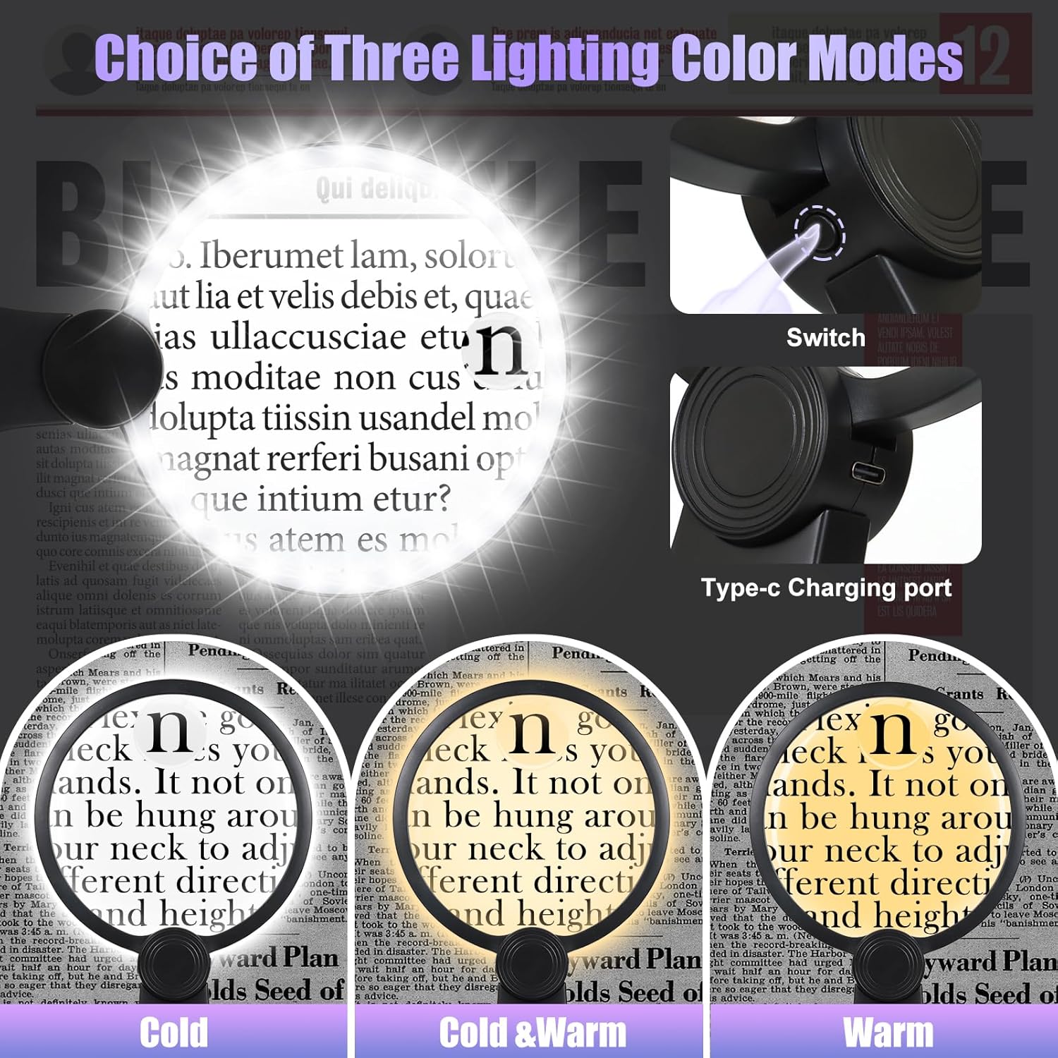 Review: We live in a world, now, where too dang many instruction manuals contain text that is just TOO small to be able to read … even with my reading glasses on. Well, the GLOWSKY company has come up with a hands-free, large magnifying glass that you can where around your neck to be able to effortlessly read what it’s in your lap or on your desk. That, and this glass would be handy when crafting or repairing items or in a thousand other tasks. You can also disconnect the neck harness and hold it by hand, using either the large 5X magnifying glass or the tiny 15X magnifying spot. The whole shebang is rechargeable and contains bright, surrounding LED lights in your choice of three white colors.Overall, this is a unique and quality large magnifying glass for which you are likely to find multiple uses. Recommended ✅