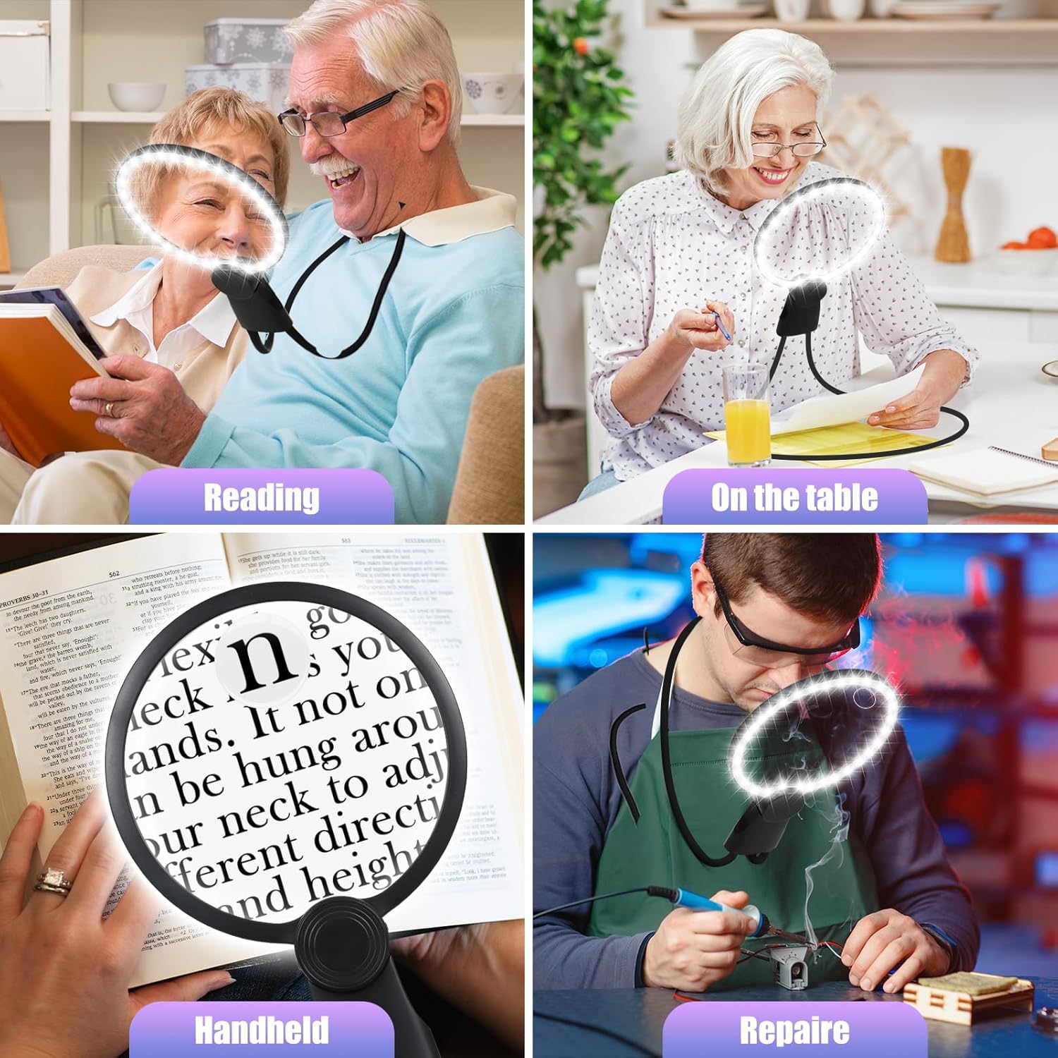 Title: “5X 15X Hands Free Magnifying Glass” — great for reading/crafts/repair/cutting fingernails