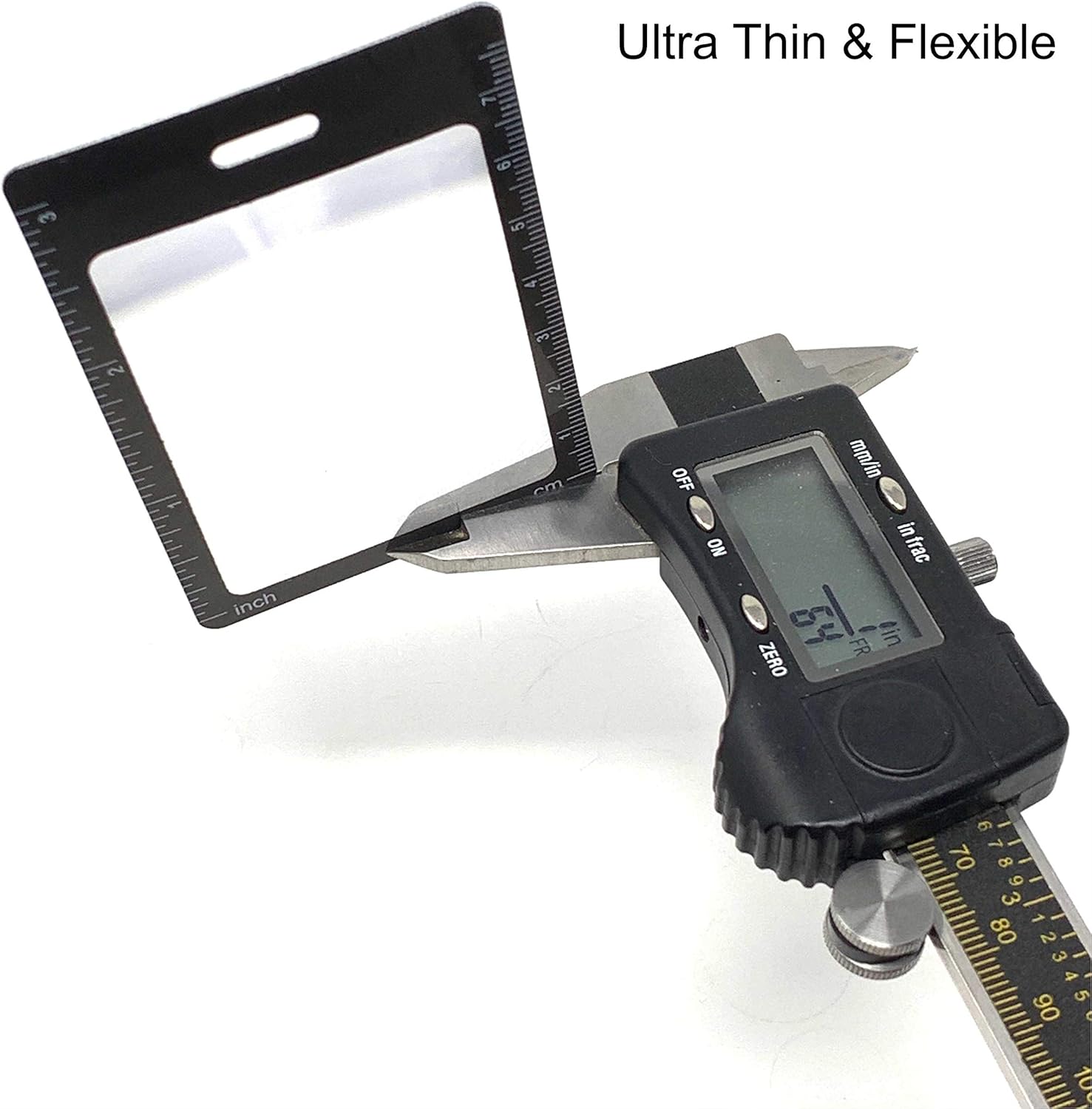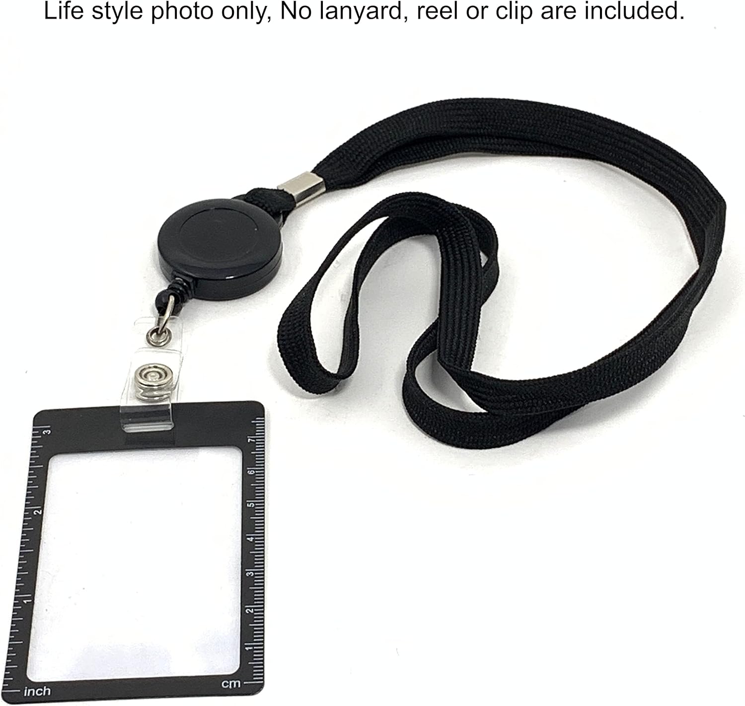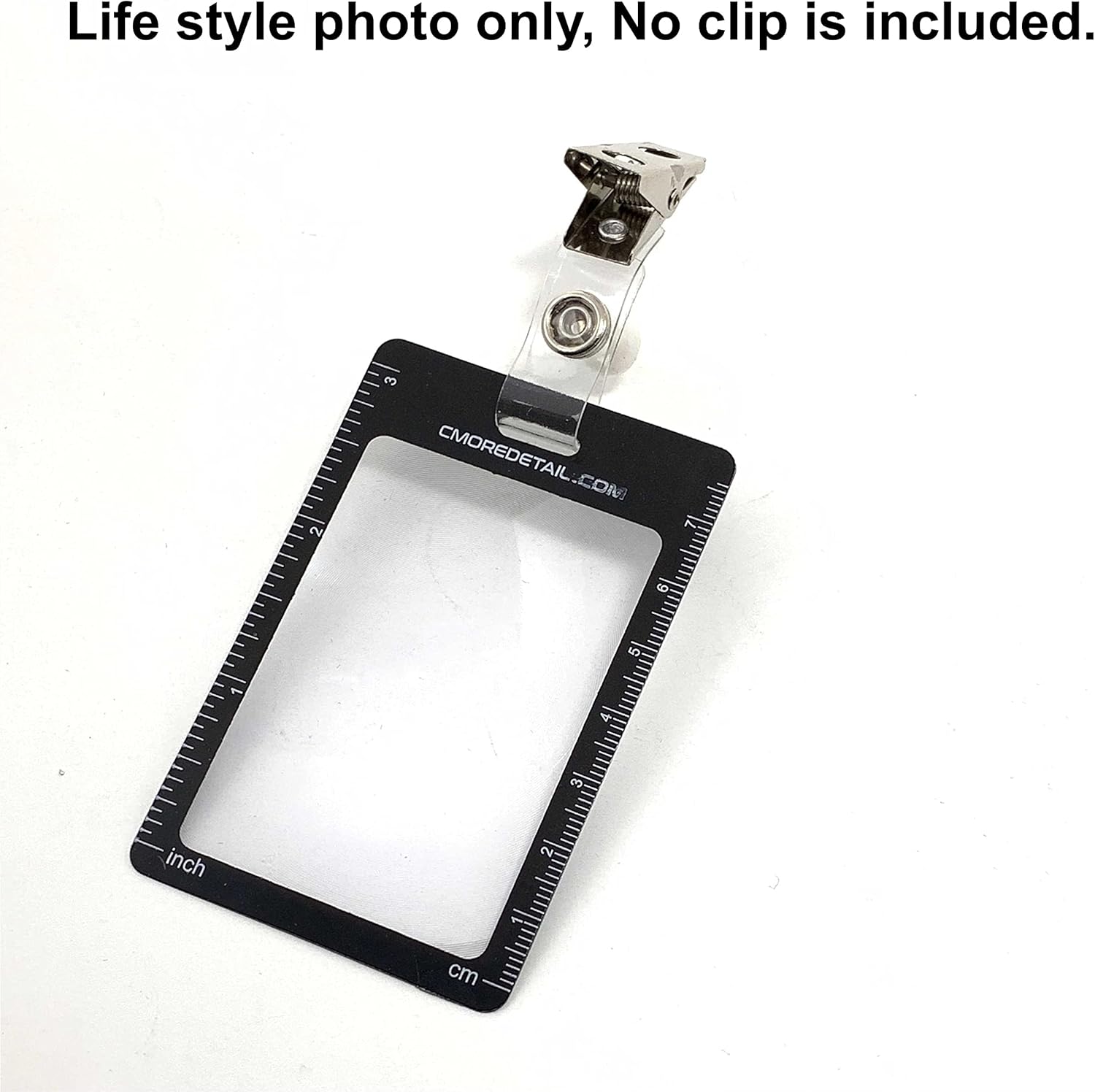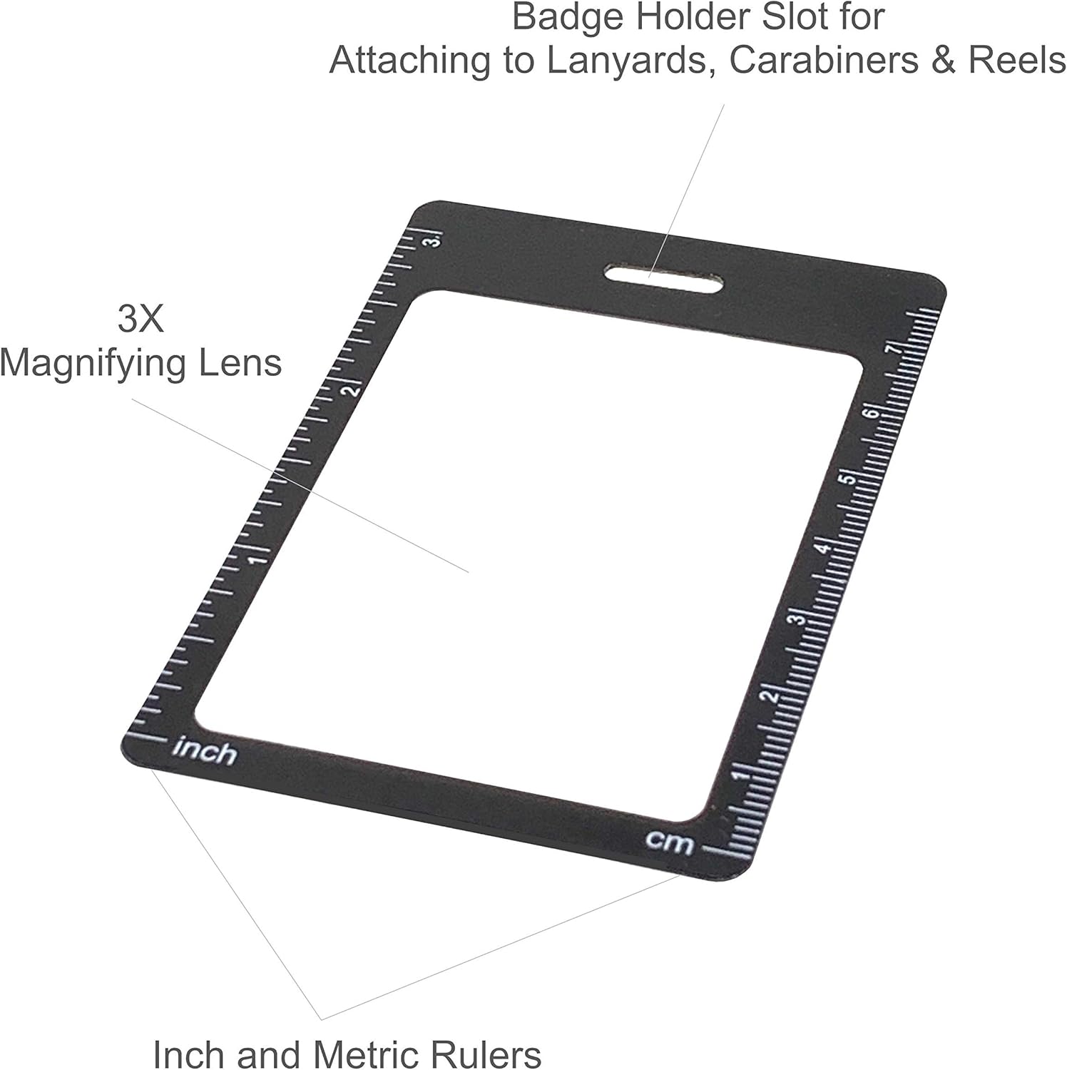Package INCLUDES … 6 Credit Card Size Magnifiers with Rulers, and Badge Holder Clip Slot for attaching to Name Badge Holder Lanyards, Carabiners, or Retractable ID Badge Holder Reels with Name Tags. Store in pocket, purse, leather wallet, pocket wallet or metal wallet. NO Name Badge Holder Lanyard, Carabiner, or Clips are included. For best magnification hold 3 to 4 inches away. 1 has no barnding, 5 are branded cmoredetail.
