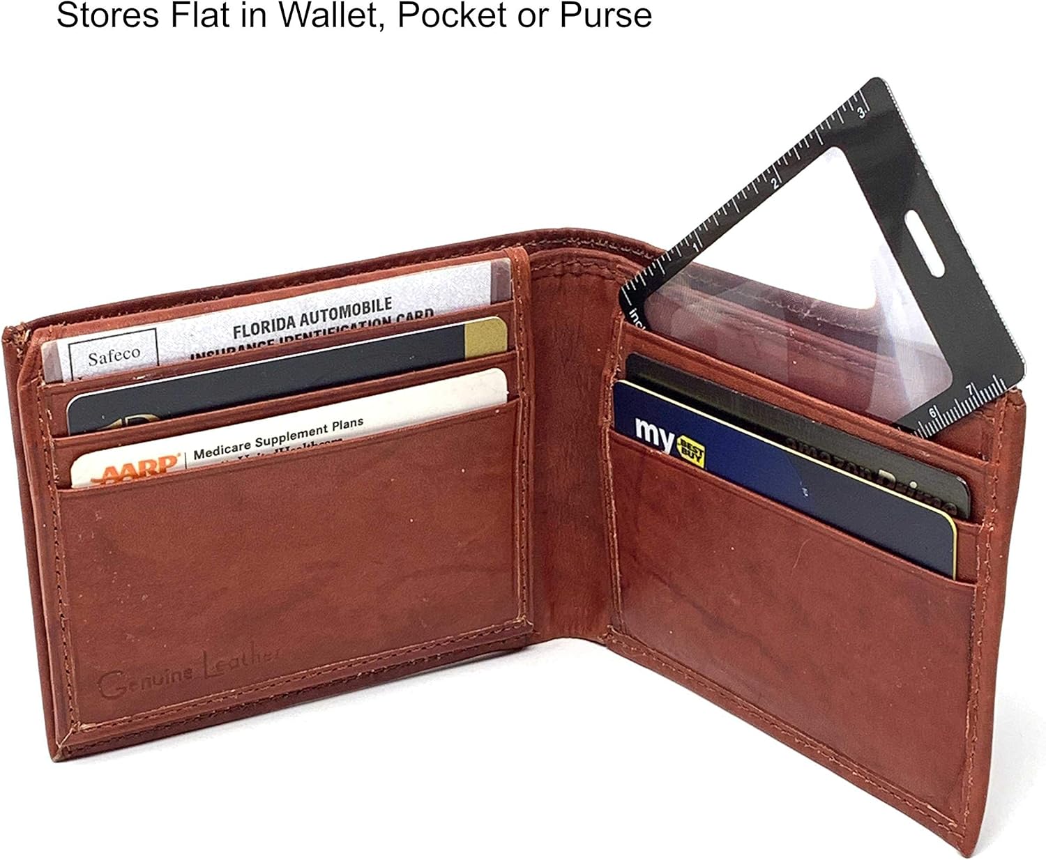 Review: Great little problem solver for those who use readers – and forget them when they go out or can’t find them when they need a little help with the fine print. BUT – and this is just a little unfortunate – I took a star off because this little handy mag card is NOT the same size as a standard credit card. I use a newer technical wallet that holds cards in a frame for easy access, and this magnifier is just a tad too wide – it won’t slip into the frame with the other cards. At least not without maybe shaving off a little on the side, which I’ll probably do. For someone with an old-school leather wallet it should be fine.