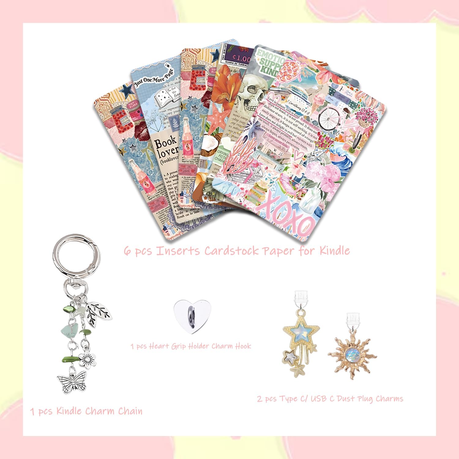 Review: 海外のTiktokを見て、Kindleをインサートやチャームでデコレーションするのに憧れて購入しました。届くのを楽しみにしていたのですが、届いたのはインサートだけで、画像にあるようなチャームやキーホルダーは入っていませんでした。日本ではこういうアクセサリーはなかなか手に入らないので楽しみにしていましたし、高かったので残念です…インサートは写真通りでとても可愛いです。