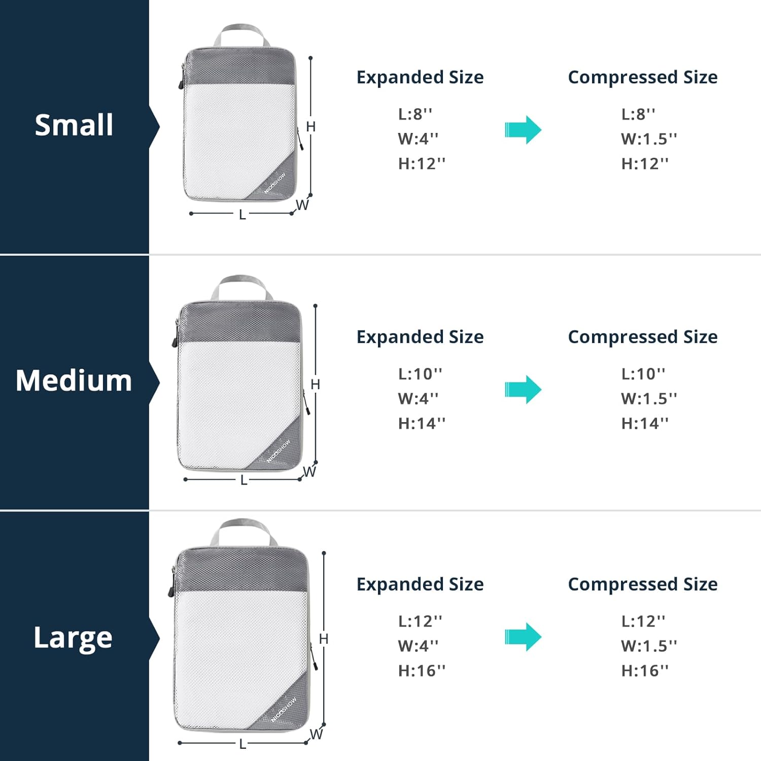 Versatile Usage: These compression packing cubes are ideal for all your travel needs, whether for vacation, hiking, or camping. It could fit ideally in 20-inch carry-ons and 22-inch luggage, as well as backpacks, duffel bags, and totes