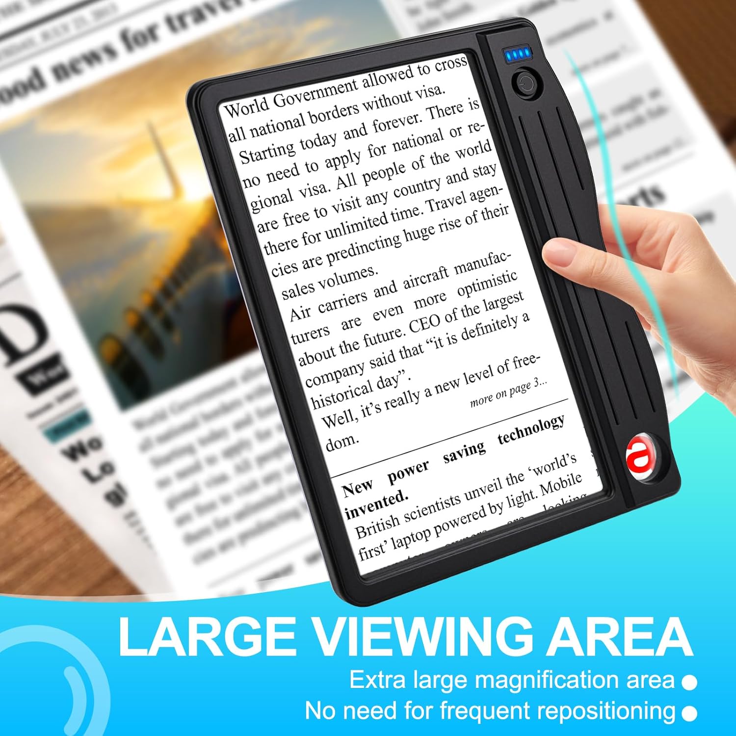Review: I purchased this for my 80 year old mother. She has been using it to help my granddaughter with her reading lessons. Mom enjoys doing this with her and this has really helped her to stay involved. This is especially important as she seems to be having some cognitive decline. Overall its a really nice item. The light on it also helps. It does need to be held, so it’s probably not practical for using for long periods of time, but fine for short reading sessions.Keep in mind, this is 6x, so there really isn’t a huge difference in the size of the magnification. However it is plenty enough to make things easier for mom.