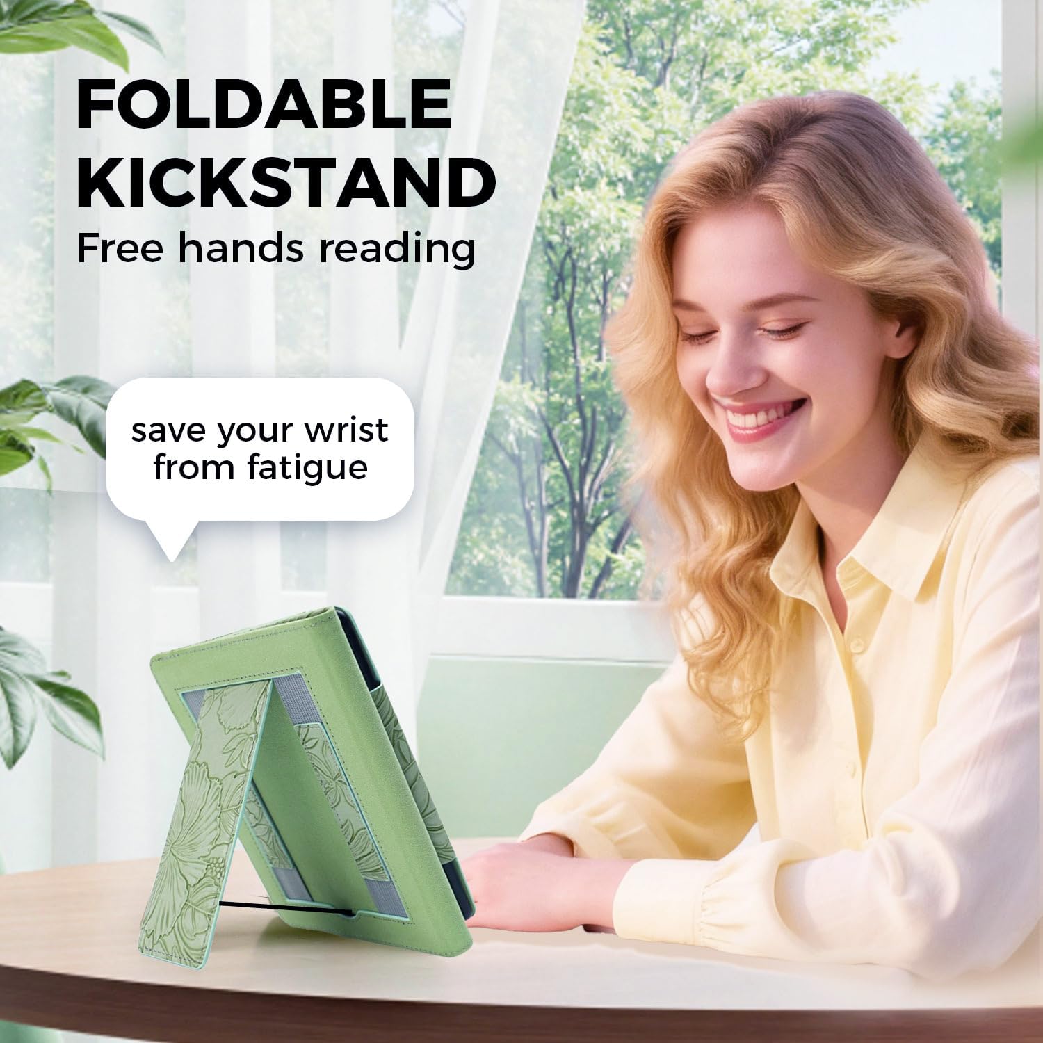 Review: I really love this Kindle case! It’s a very pretty pale green, and the embossed feel of the flowers and leaves is so nice. The magnet to hold the case closed is very strong, while still being easy to open. It’s great that the front of the case magnetically clings to the back while open and that it turns on when opened and off when closed. I especially love the little stand so I can lay it on the counter or table and not hold it the entire time. I don’t find any use for the hand straps, but I’m so happy they have two of them, as I’m a lefty, and most items are made exclusively for righties. I worried when I first tried to slide my Kindle in that I’d ordered the wrong size case, as it was a tight fit. Once inside, I realized this is a great feature, as another case I have is slightly large, and my Kindle slides around more than I’d like. I highly recommend this case and am so happy to have it!