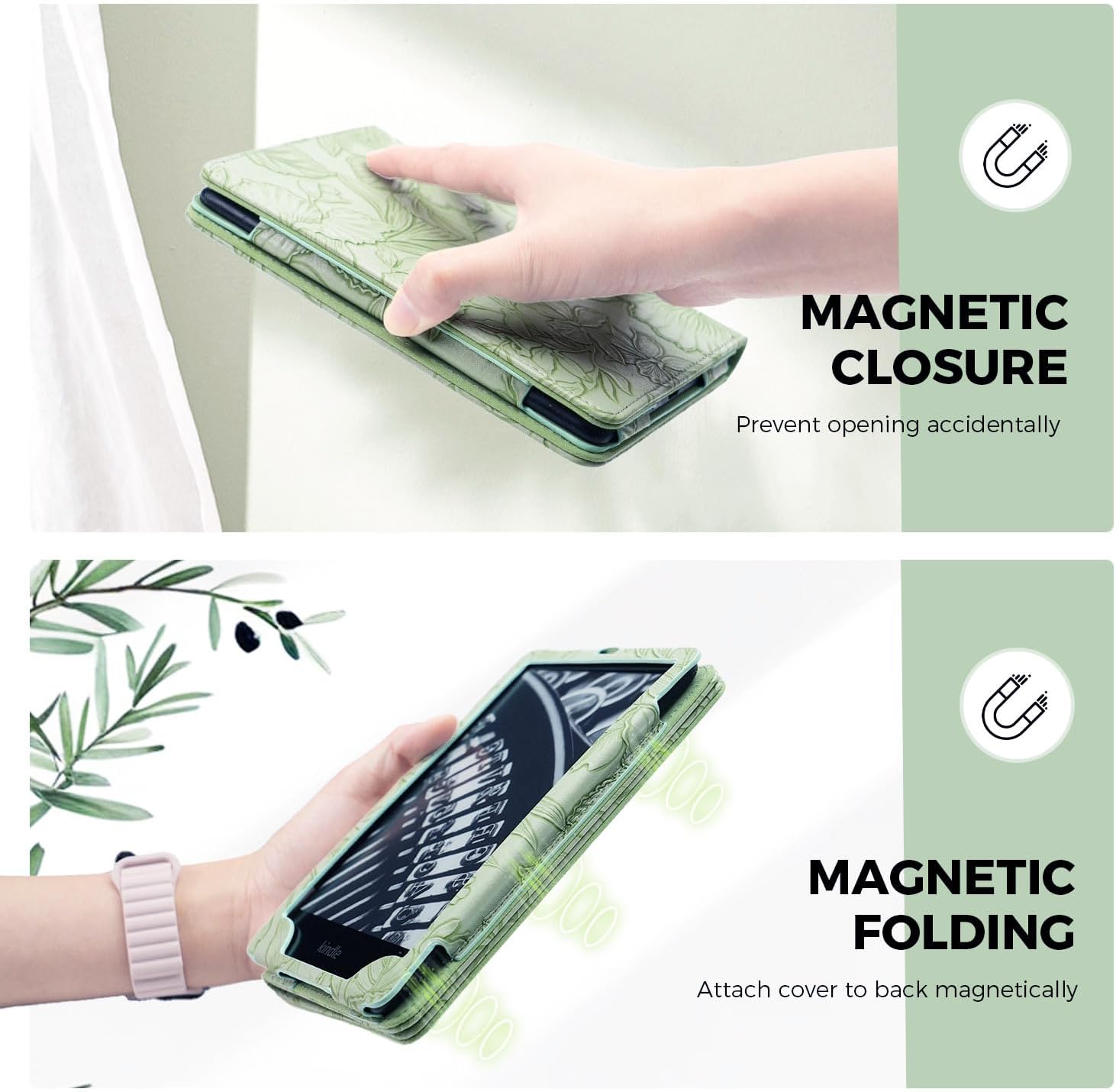 Review: I really love this Kindle case! It’s a very pretty pale green, and the embossed feel of the flowers and leaves is so nice. The magnet to hold the case closed is very strong, while still being easy to open. It’s great that the front of the case magnetically clings to the back while open and that it turns on when opened and off when closed. I especially love the little stand so I can lay it on the counter or table and not hold it the entire time. I don’t find any use for the hand straps, but I’m so happy they have two of them, as I’m a lefty, and most items are made exclusively for righties. I worried when I first tried to slide my Kindle in that I’d ordered the wrong size case, as it was a tight fit. Once inside, I realized this is a great feature, as another case I have is slightly large, and my Kindle slides around more than I’d like. I highly recommend this case and am so happy to have it!