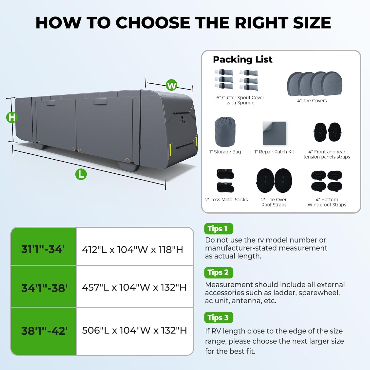 【EASY INSTALLATION】 Our kits come ready to install and include 2 toss mental sticks for easy tying of bottom straps, 6 gutter spout covers with sponge inside to protect your cover from sharp gutters. The front and rear reflective strip design makes your RV more visible at night.