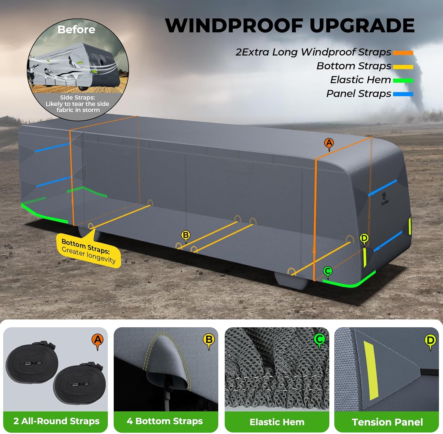 【WINDPROOF & SNUG FIT】 We have redesigned the 4 straps and buckles and sewn them at the bottom of the RV cover to reduce tearing from side panels. Additionally, 2PCS 42’ ALL-AROUND straps ensure a snug fit, and elastic and thickened hem corners and 4 straps on the front and rear panels can also be tightened to customize the fit.