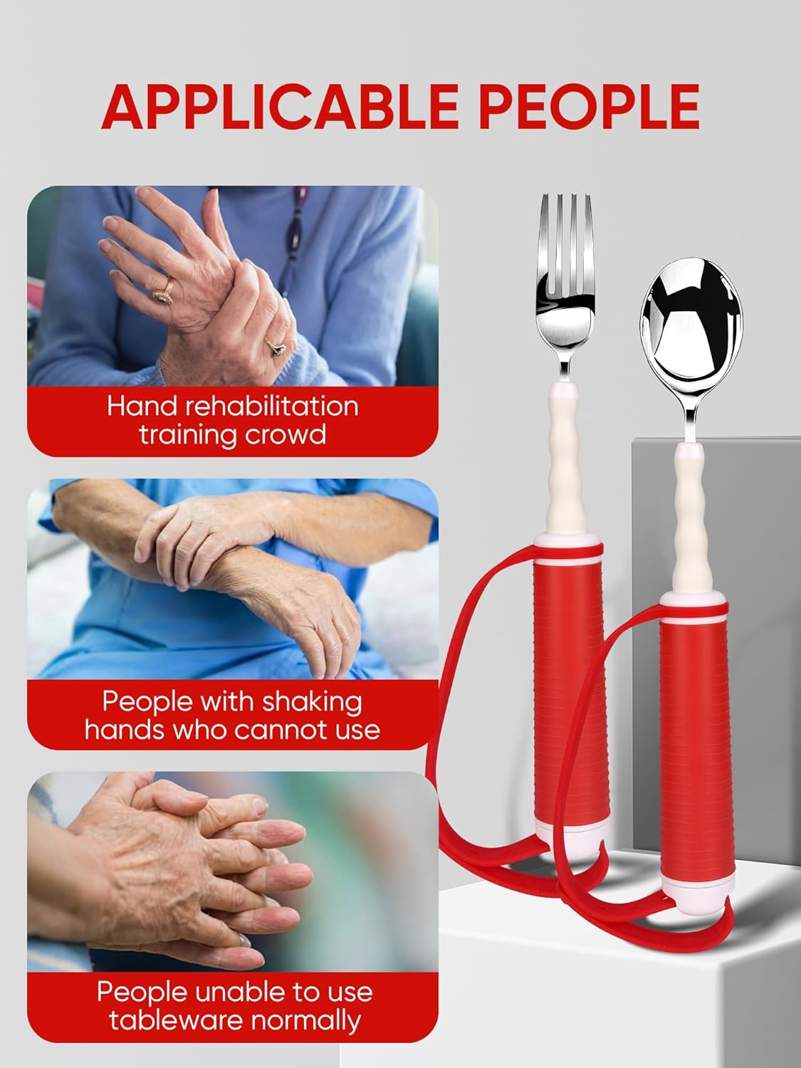 Review: These have given my mother her independence back when eating! The adjustable straps keep them snugly in place in her hands and they are bendable so they can be customized to her position/ posture. Another valuable tool for independence!