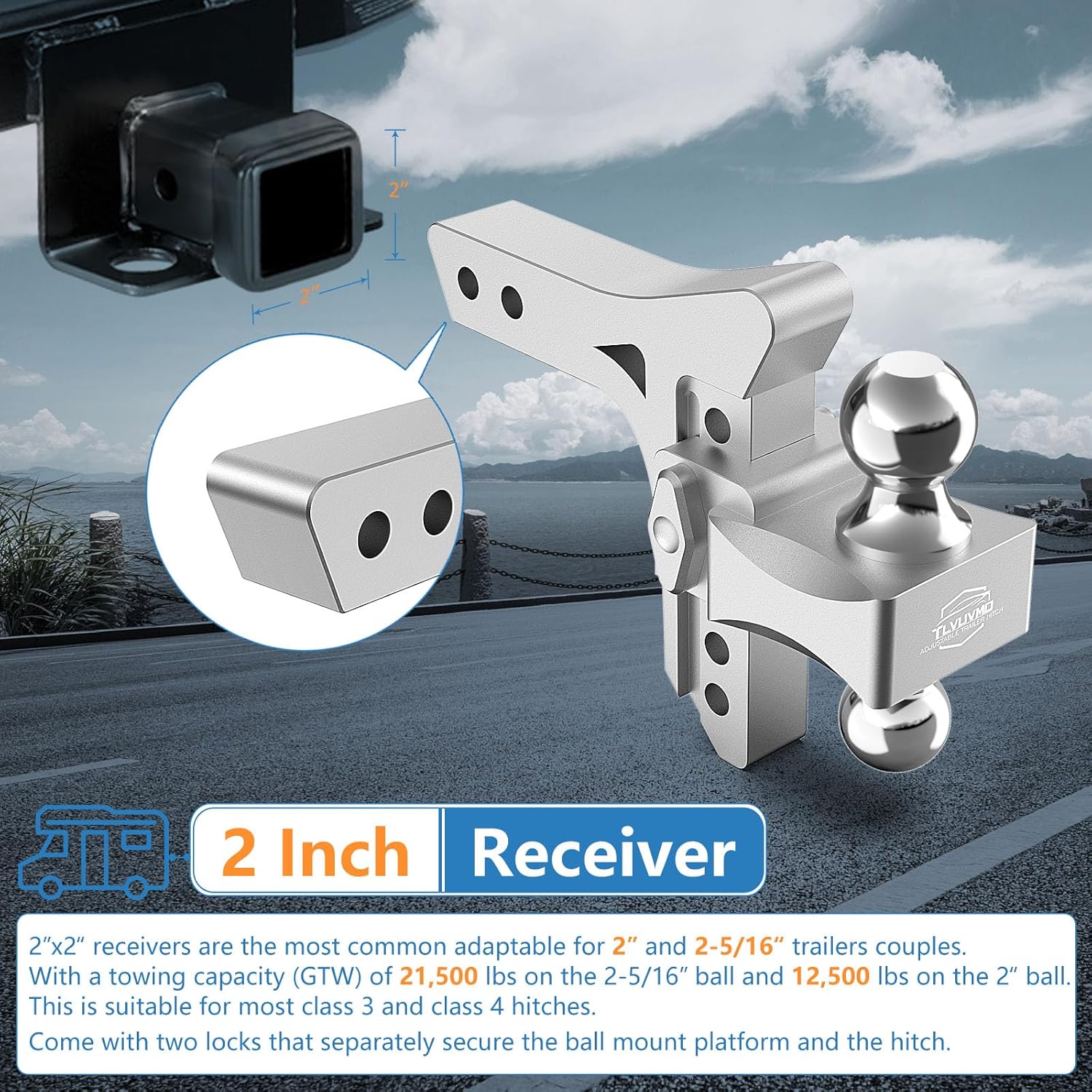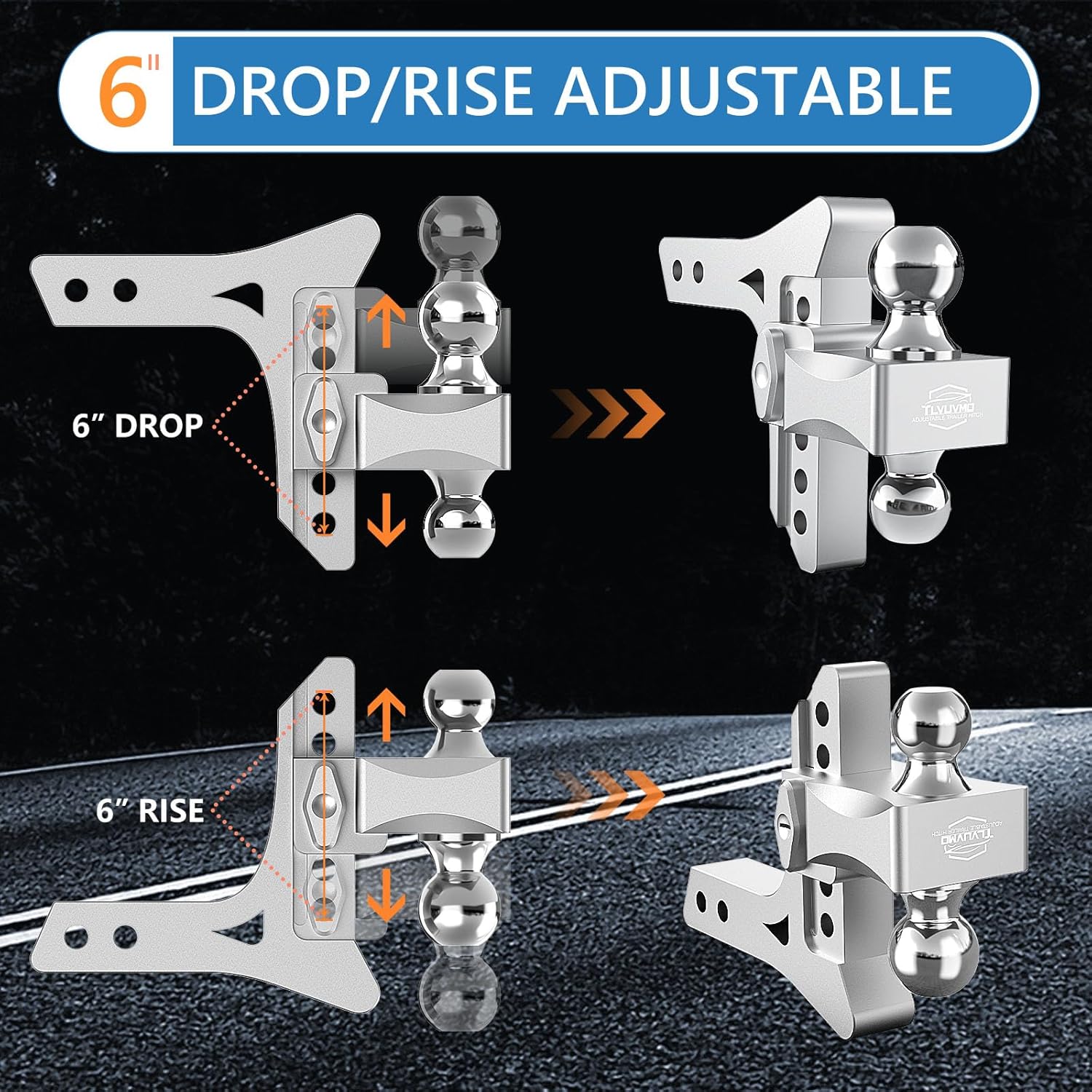 🛻 EASY TO USE: - Tlvuvmo Adjustable Hitch Provides 6" Drop/Raise, Adjustable In 1" Increments, Helps To Prevent The Trailer From Swaying, Suitable For Different Vehicles, Just Need to Determine The Location Of The Trailer, Tractor, Rv, the Desired Height To Be Used In The Drop Or Rise Position Which Is Adjusted By Simply Pulling A Pin And Moving The Ball Mount To That Position