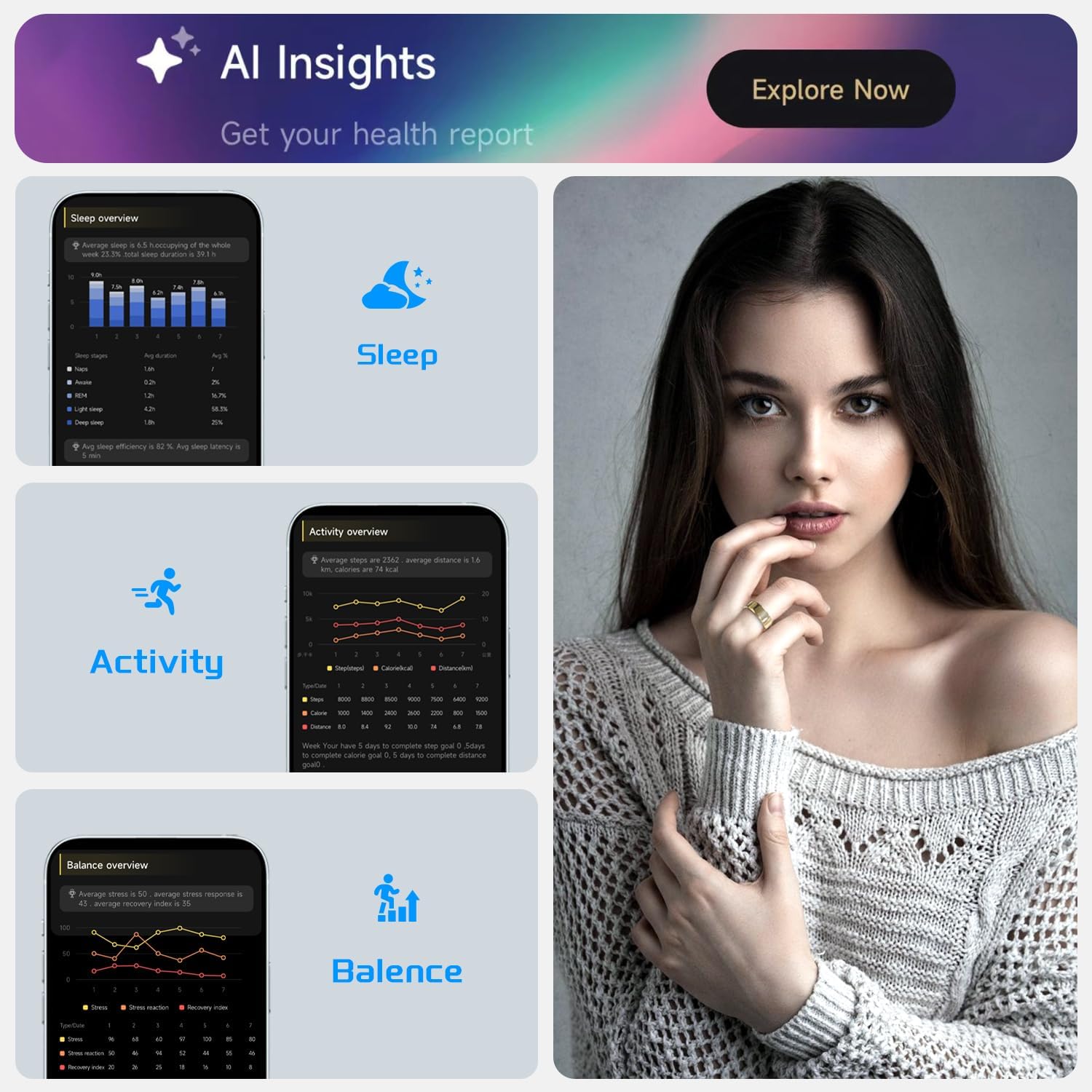 JCRing Gen4 AI Smart Ring, an all-in-one health data monitoring device that integrates sports tracking, sleep analysis, daily activity recording, 24/7 heart rate monitoring, heart rate variability assessment, blood oxygen saturation detection, and stress management. By regularly uploading your health data, whether weekly or monthly, users can leverage its advanced AI analysis engine to obtain personalized health reports, making it an invaluable assistant for your daily health management.