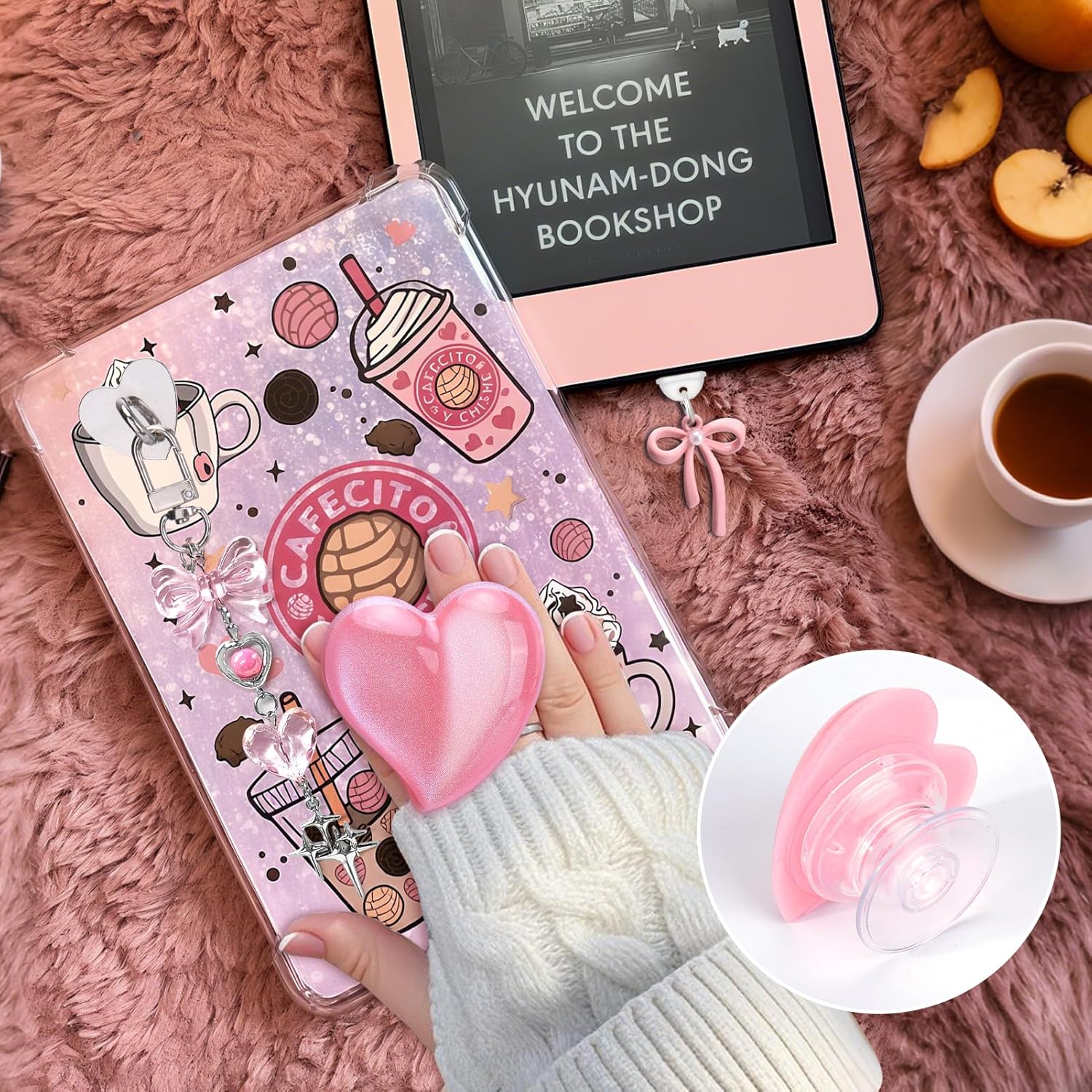 Review: This set is very cute and looks great on my Kindle, but the quality wasn’t what I expected. The heart charm was really hard to remove from the peel, and after only about a week of use, most of the charms fell off. The pop socket and the dust charm are the best parts — they work well and look adorable. I wish the charms were more secure so they would last longer.