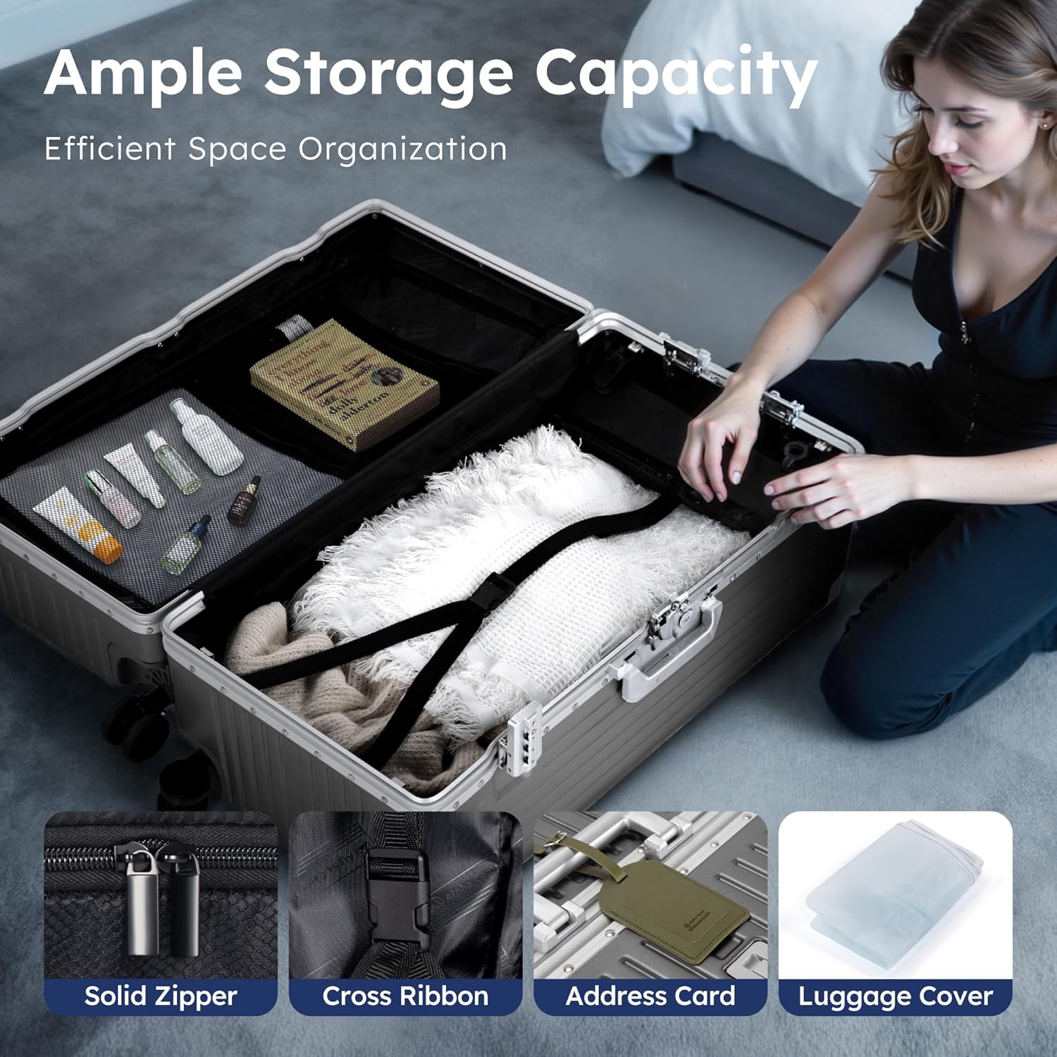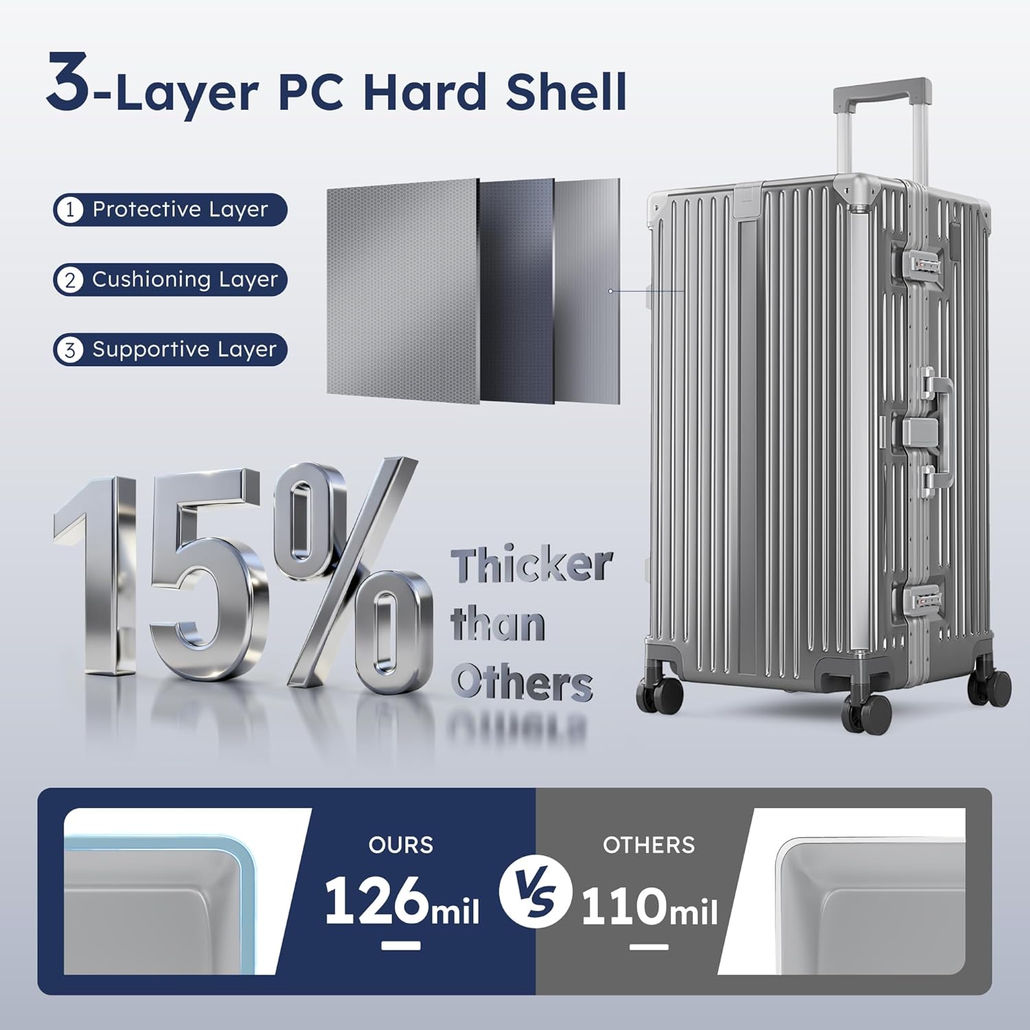 Premium PC + Aluminum Frame Materials: This combination is remarkably lightweight yet reinforced to resist warping. Four sturdy aluminum corner guards absorb impact from rough handling during transit. Our high-quality aluminum telescopic handle ensures a smooth, reliable pull and significantly reduces the risk of breaking. With near-metallic sheen panels and a frame that are 15% thicker than standard, your valuables are perfectly protected, elevating your entire travel experience