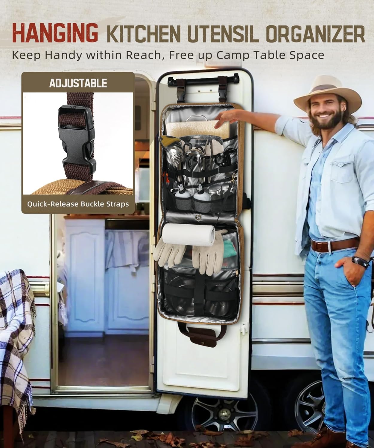 Convenience & Portability: This camp kitchen organizer features padded handles for easy carry and dual top adjustable buckles for hanging. With the ability to open 180° and hang from a car, tree, or tent, its 15-liter capacity comfortably stores essentials, making it useful for camping and picnics.