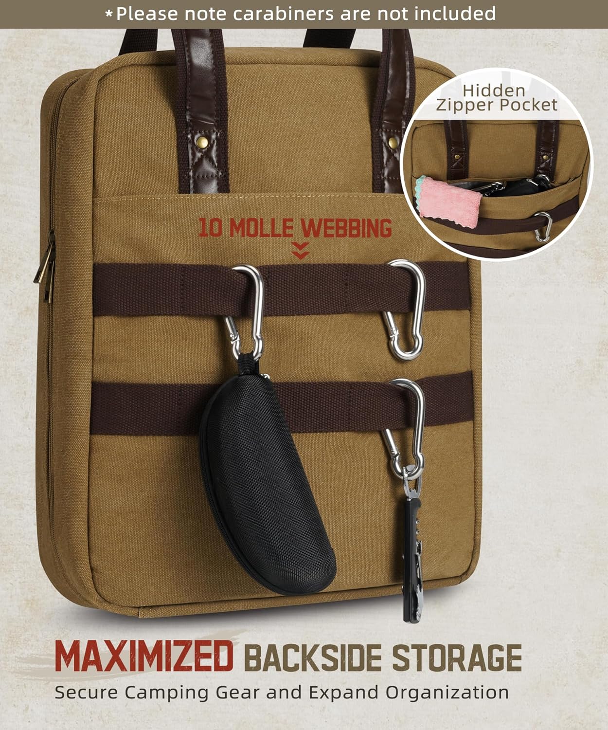 Versatile Storage & Organization: Made from 16oz washed canvas, this camping utensil bag features 2 rows of molle webbing for quick access to items. Inside, dual-layer and large zippered pockets store gloves and mats, while front interior pockets and elastic bands organize spatulas, tongs, and other barbecue tools.