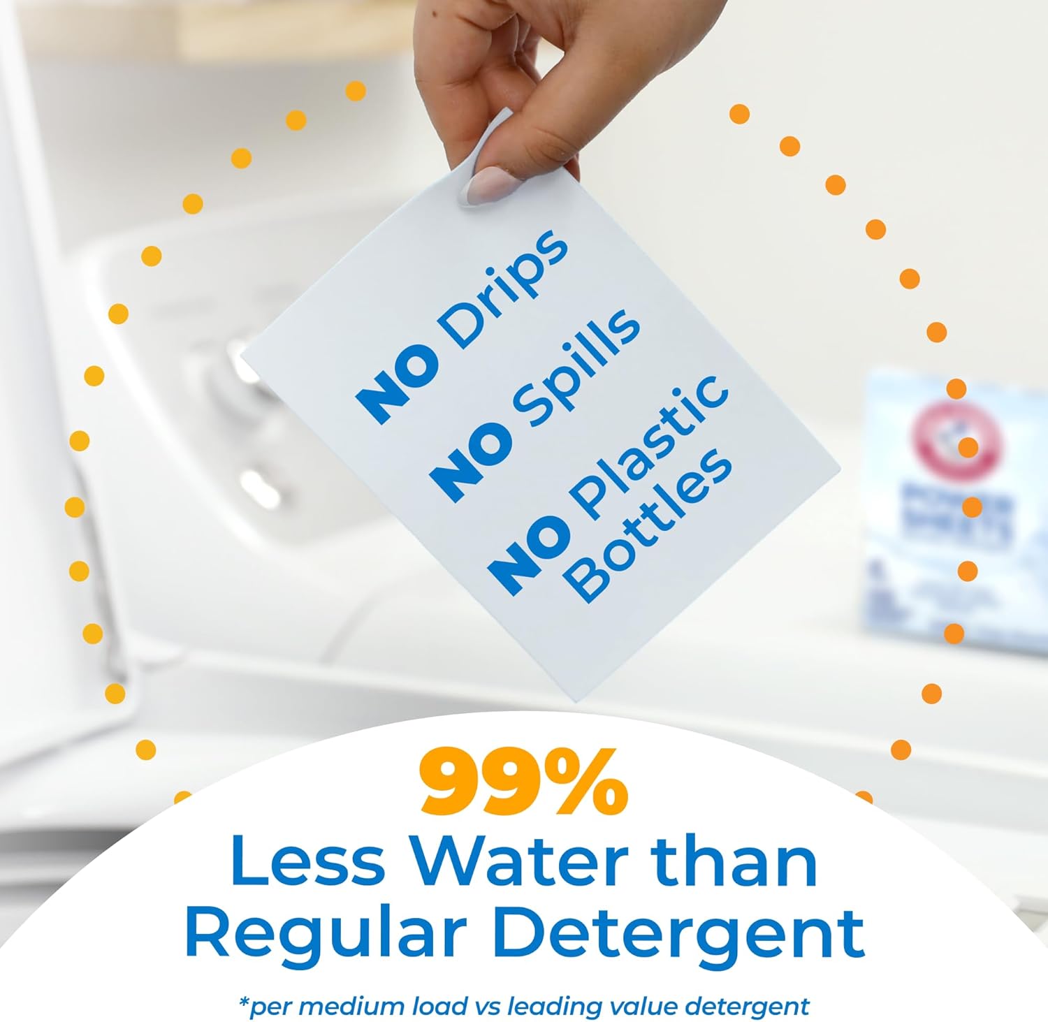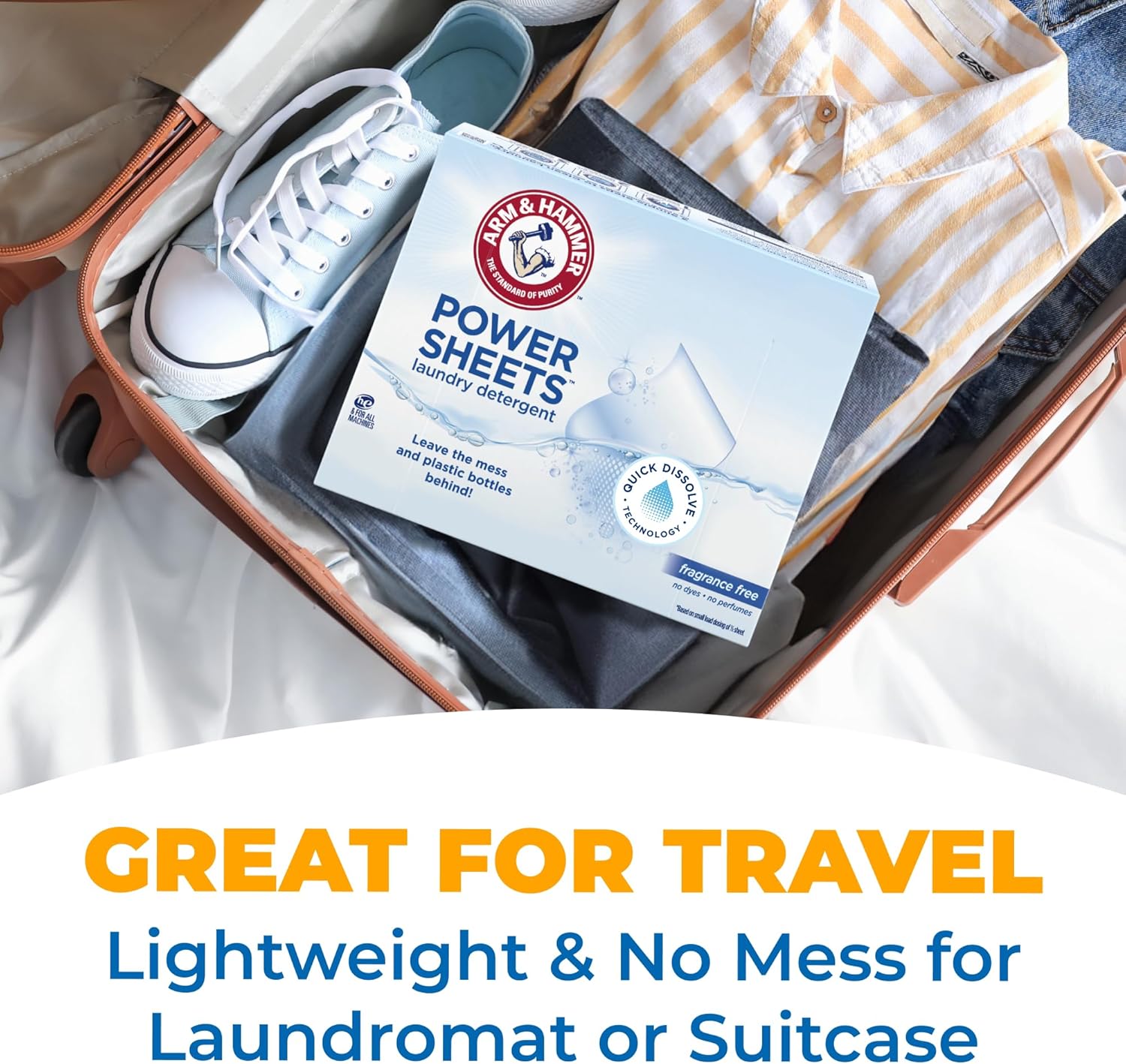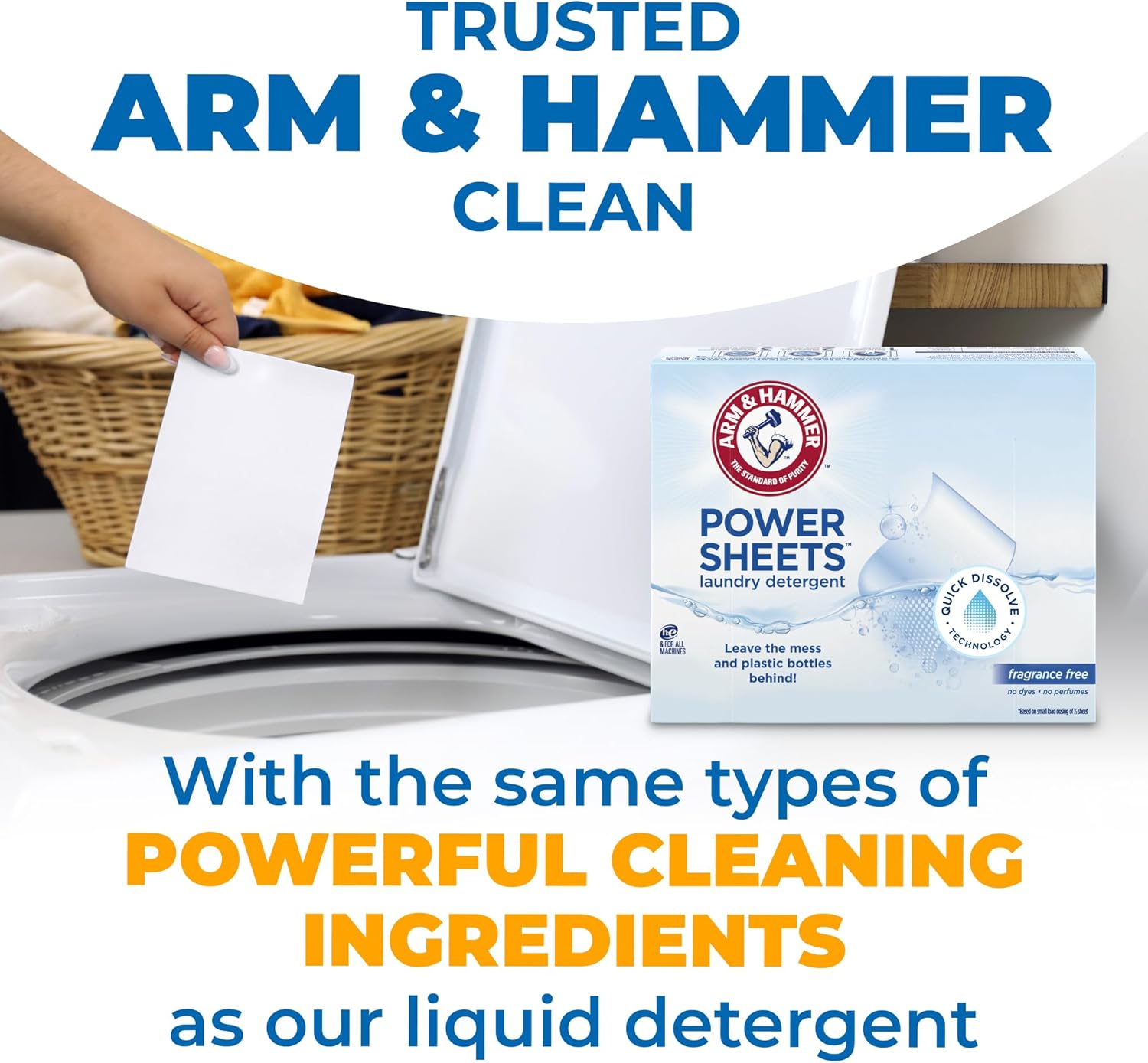 For a powerful, deep clean without plastic bottle waste or mess, use ARM & HAMMER Power Sheets Laundry Detergent, Fragrance Free, 50 sheets, cleans up to 100 small loads when used as directed. Are you concerned about your impact on the environment? If you are, ARM & HAMMER has designed this product to eliminate plastic bottle waste. The fragrance free laundry detergent sheets are dermatologist tested, no dyes, unscented and perfume-free. They come in lightweight, recyclable boxes so no more lugging and pouring heavy, drippy bottles. This innovative laundry detergent sheet is ideal for travel—light, portable, convenient for laundromat or suitcase. The no-bleach, no-ammonia concentrated laundry detergent sheets are tough on odors, dirt, and stains. These unscented HE detergent sheets can handle tough loads of dark, colored or white clothing in all wash temperatures, even cold water. Thanks to Quick Dissolve Technology, these high efficiency laundry detergent sheets dissolve completely in water. Use 1 sheet for small loads, or 2 sheets for medium loads. Made with the same type of powerful cleaning ingredients as ARM & HAMMER Laundry liquid detergents, for the trusted clean and value you expect from ARM & HAMMER.