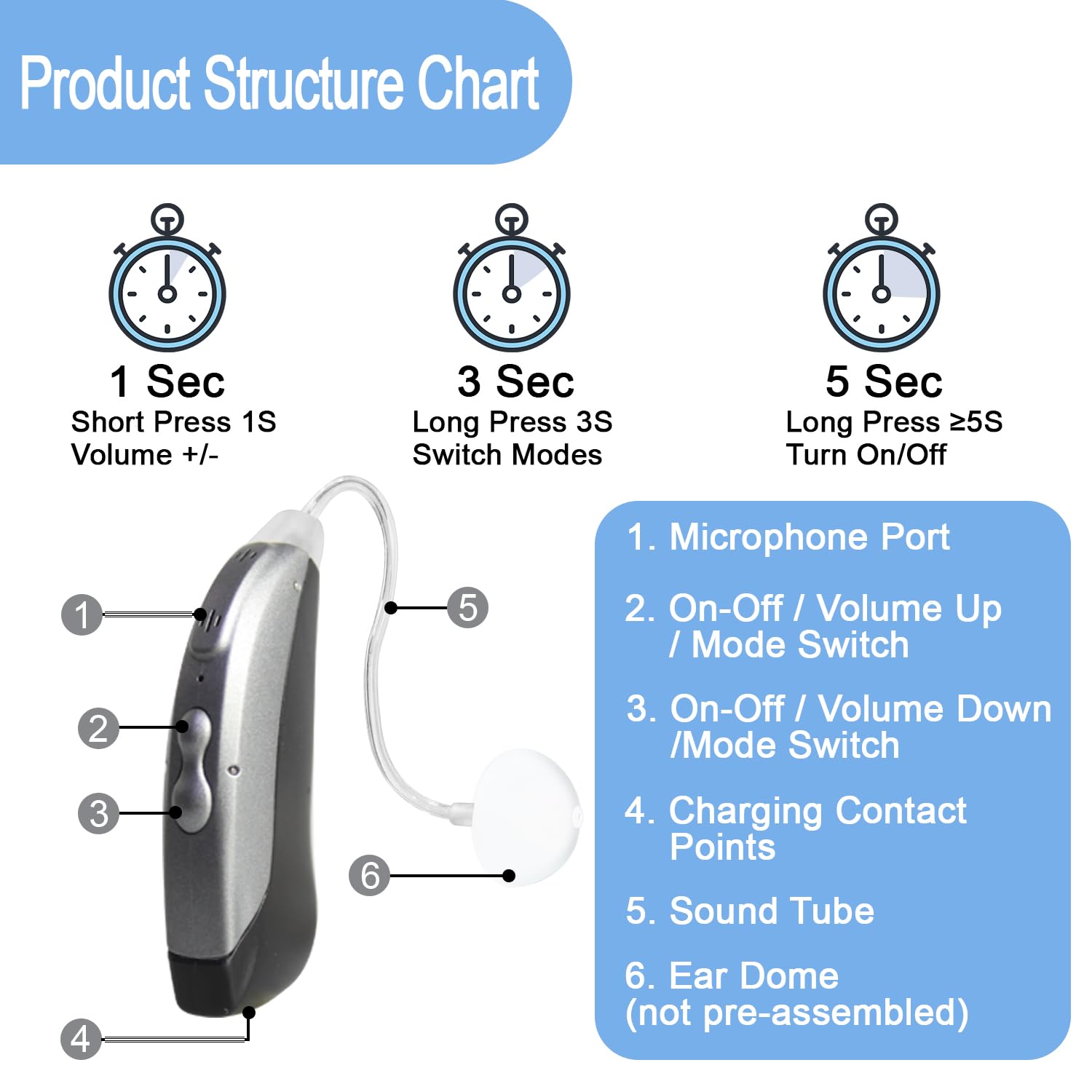 Review: These hearing aids from Banglijian are really great. I tried several other brands of hearing aids and Banglijian is so far the company that provided me with the best hearing aids. Their support is outstanding and they always reply to questions I have timely. This model 708 has a small tube that allows setting up comfortably hearing sensor into the ear canal. They come with several kind and sizes of hear domes which allows choosing the dome that will fit best in your hear. I barely notice them when I wear them. The sound is fantastic and really correct my lack of hearing. There are 4 different modes like normal, noise reduction, outdoor and phone mode which is really great to reduce the whistle when your phone is close to your ear. I am very pleased about the performance and comfort these hearing aids provide. You can turn on or off the hearing aid yourself or simply place them in the charging box which has its own battery that can support several charges which is very convenient when you travel and don’t have access to power. The AC adapter and cable are provided. The instructions for use are really well made and easy to understand. If you want great hearing aid at an affordable cost then go for this one!