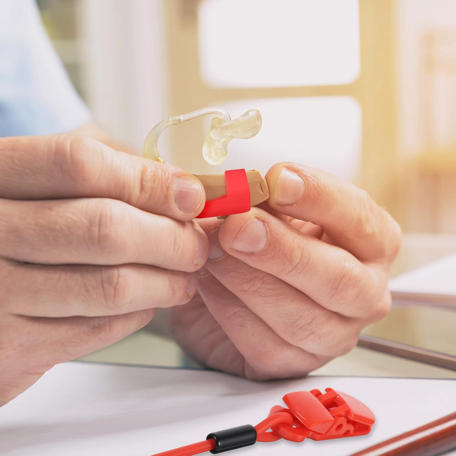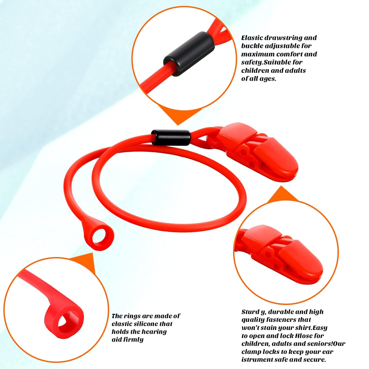 These hearing aid lanyards with clips consist of 3 parts, including 1 clip, 2 silicone loops, and 1 adjustable silicone rope. You can adjust the length of the lanyard to fit your size and the silicone loop can grasp your hearing aids tightly without slipping.
