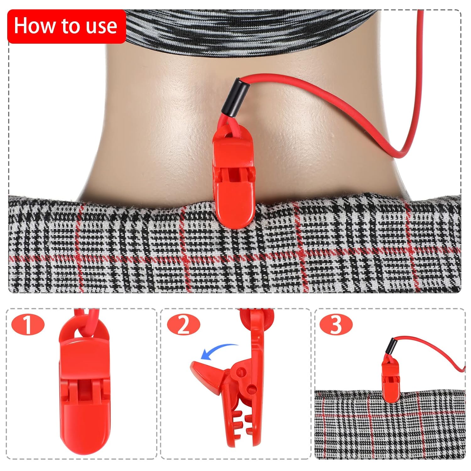 Review: These devices have tiny jaw-like clips for securing the lanyard to a shirt collar.  These clips have a tab to press to open the jaws, but the tabs don’t work – no matter how hard you press the jaws don’t open.  I didn’t try but maybe you could use tweezers to pry the tiny clips open so you could slide them onto your shirt collar.