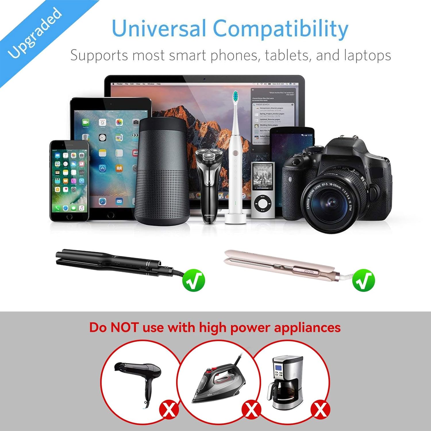 NOTICE: Not compatible- hair dryer, iron machine, coffee machine, etc. (Regardless of their wattage)