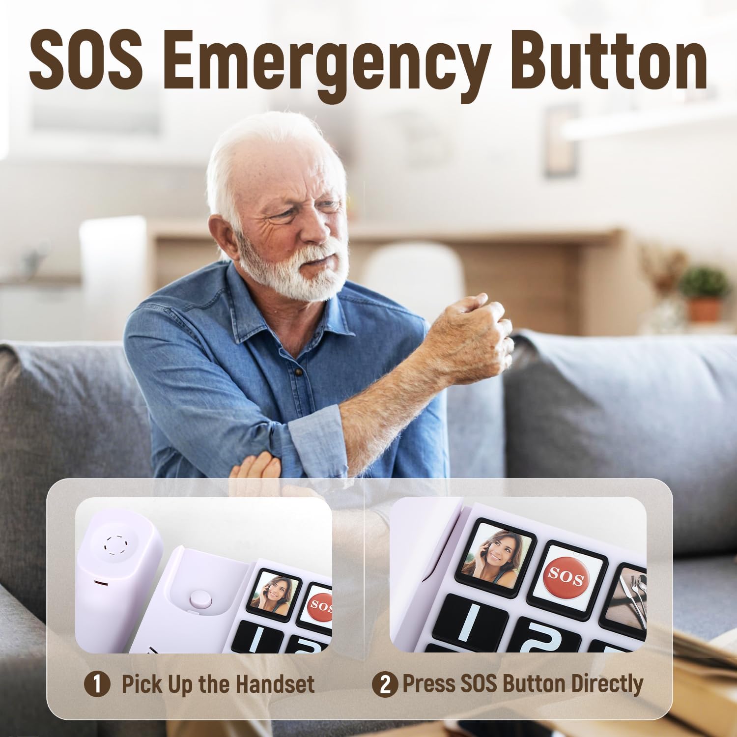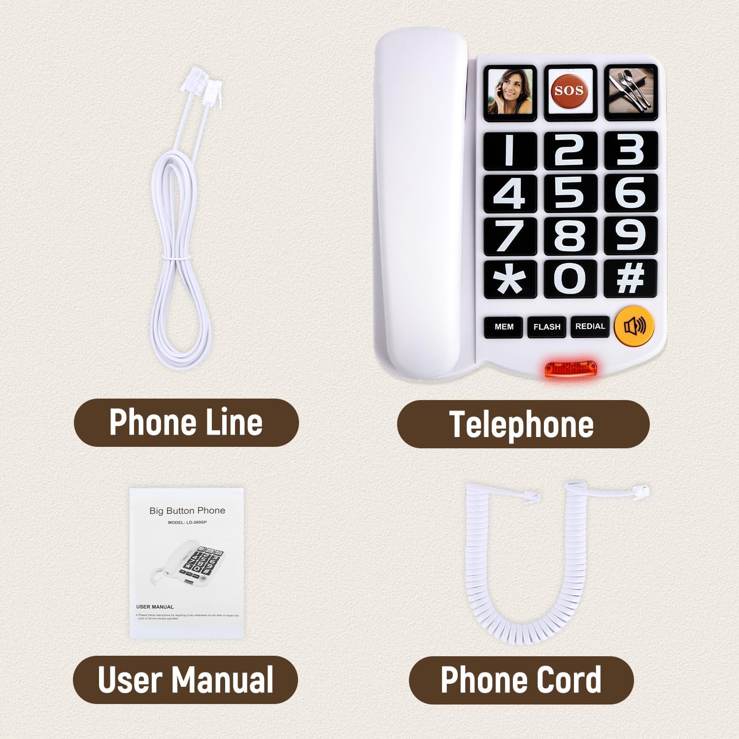 One-Touch Large Buttons: This desk phone has 2 one-touch buttons for frequent contacts and 1 SOS emergency button, with customizable photos. It also features 10 two-button memory sets. Note: Do not unplug the phone line, or stored contacts may be lost