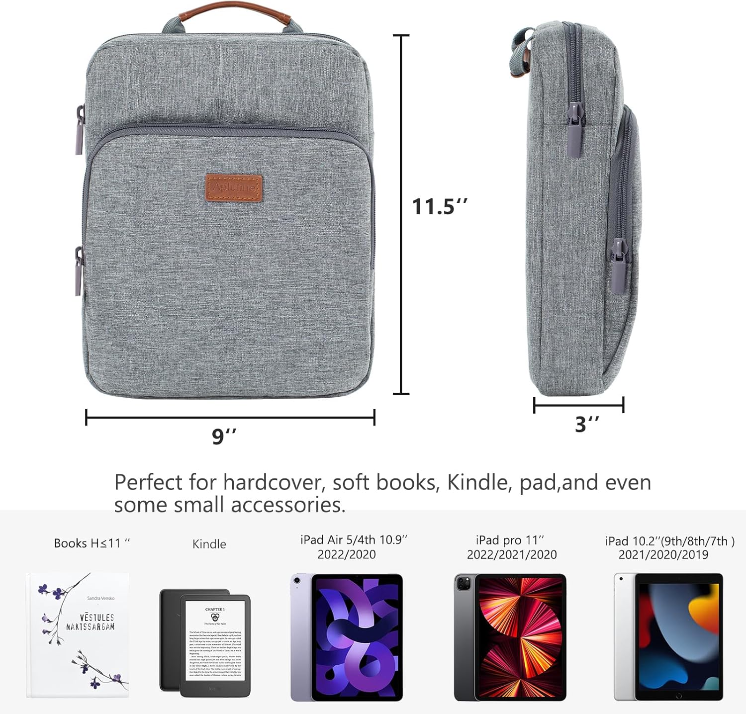 Review: High School son has an iPad for school. He carries the iPad in his school backpack most days, however, if he is just taking his iPad somewhere (say, on the weekend), he uses this. It has a front pouch for supplies. Perfect fit!!!You can likely fit a paperback book in with the iPad or notecards if needed.