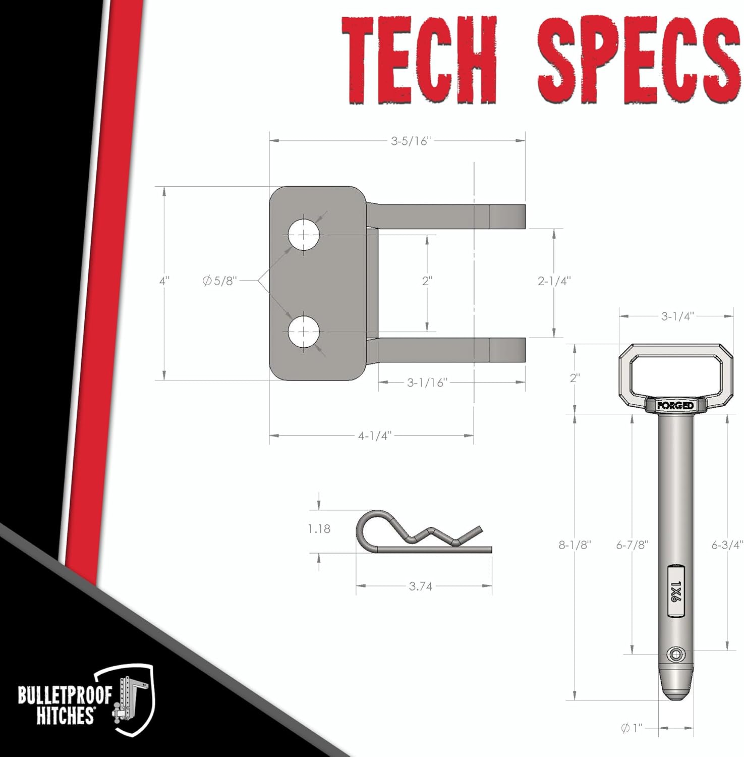 What's Included: Includes one 2-Tang Clevis Attachment, 1" Clevis Pin with Easy Pull Handle, two 5/8" Corrosion-Resistant Pins, and two R-Clips