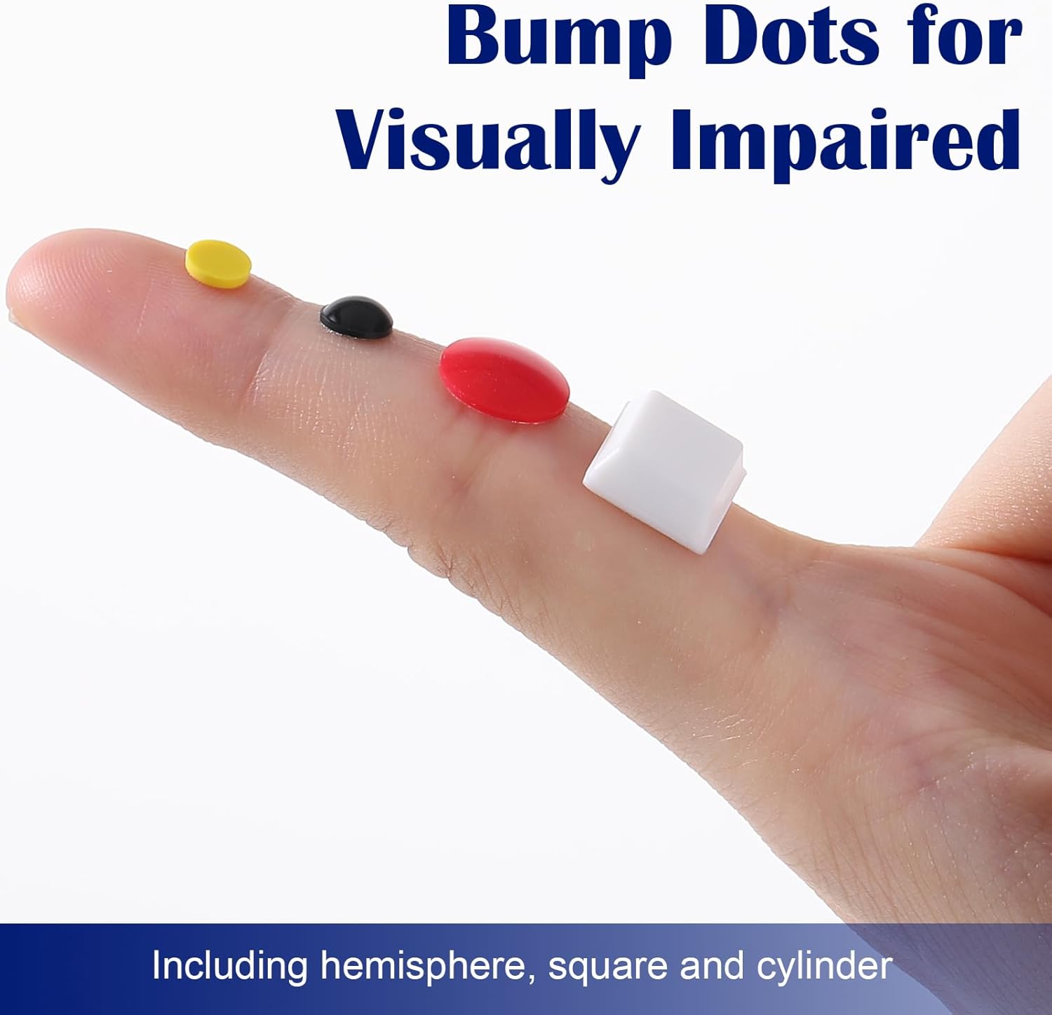 B0F1VR3TKV,     Introducing our 180-piece bump dots for visually impaired, a comprehensive solution designed to enhance accessibility for individuals with low vision. These braille stickers are crafted to provide tactile identification for everyday items, making them ideal low vision aids for macular degeneration, glaucoma, and blindness. With diverse shapes including hemispheres, cylinders, and squares, ranging from 0.2 to 0.4 inches, these bump dots offer a tailored tactile experience to meet various identification needs.