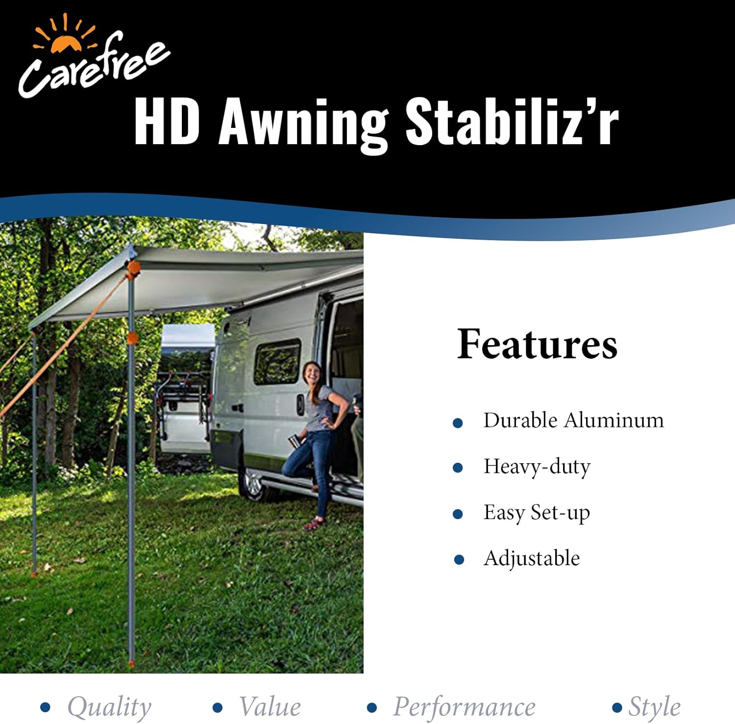 Your Awning's Ultimate Support Partner: Prioritize the safety and stability of your RV awning with the HD Awning Stabiliz’r Pole Kit. Compatible with all vertical arm awning brands, this versatile accessory is an indispensable addition to your camping toolkit. Collapsible to a compact 58 inches, the HD Awning Stabilizer Pole Kit easily accompanies you on your adventures. Upon assembly, it extends up to an impressive 108 inches, catering to diverse awning sizes. Crafted from heavy-duty aluminum, the poles feature a swivel foot for easy pegging, ensuring a secure hold. Included metal body stakes and heavy nylon straps find their organized home in a convenient drawstring bag.