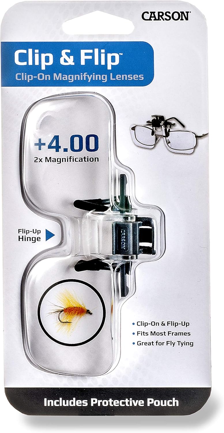 B004HW6CBS,  The Carson Clip and Flip is a flip-up, 2x power Magnifying Lens that turns any pair of regular glasses into a “flip-down” hands-free magnifier. This magnifying glass is a 2x power equivalent to a +4.00 diopters. It comes included with a pouch. Use your Clip and Flip Magnifying Lens for Fly-Tying or any other hobby or craft where you need two hands. At Carson, we strive to make sure our customers are 100% satisfied with the quality of our magnifiers. Carson will repair or replace your magnifier if it is found to have manufacturing defects in materials or workmanship..