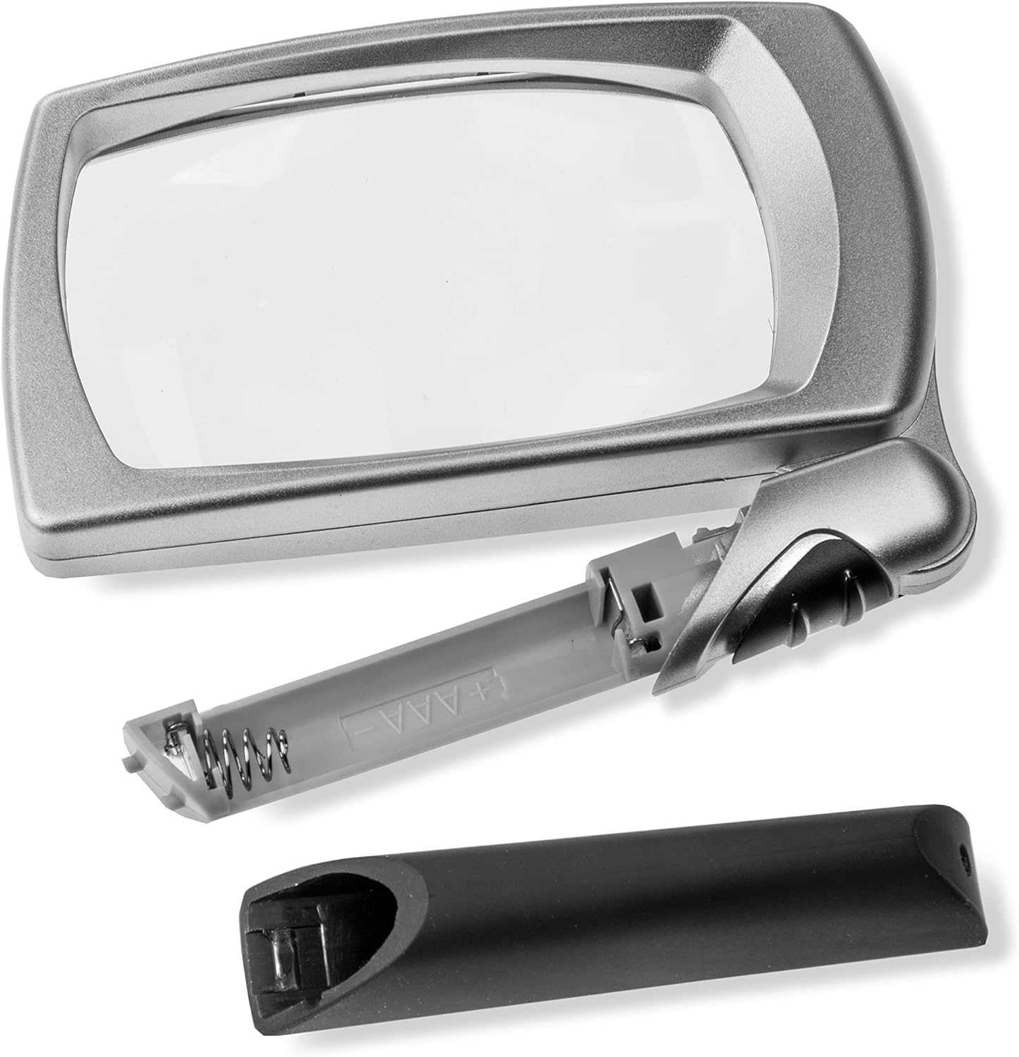 B000C6YIT6, A 3x magnifier with a rubberized handle, tucked in an acetate gift box. Unfold the handle and give the rubberized portion a light tug to reveal the battery compartment. Insert one AAA battery, replace the handle and slide the ridged button up to illuminate the long-lasting LED light. (LED light lasts for 8 continuous hours, or 100,000 hours if used only intermittently.) Powerful magnification and light are now in your hands for on-the-spot magnification of reading materials or hobby-work. The scratch-resistant acrylic lens measures 2″ x 3″ – the perfect size for using while still being…, 4.5,