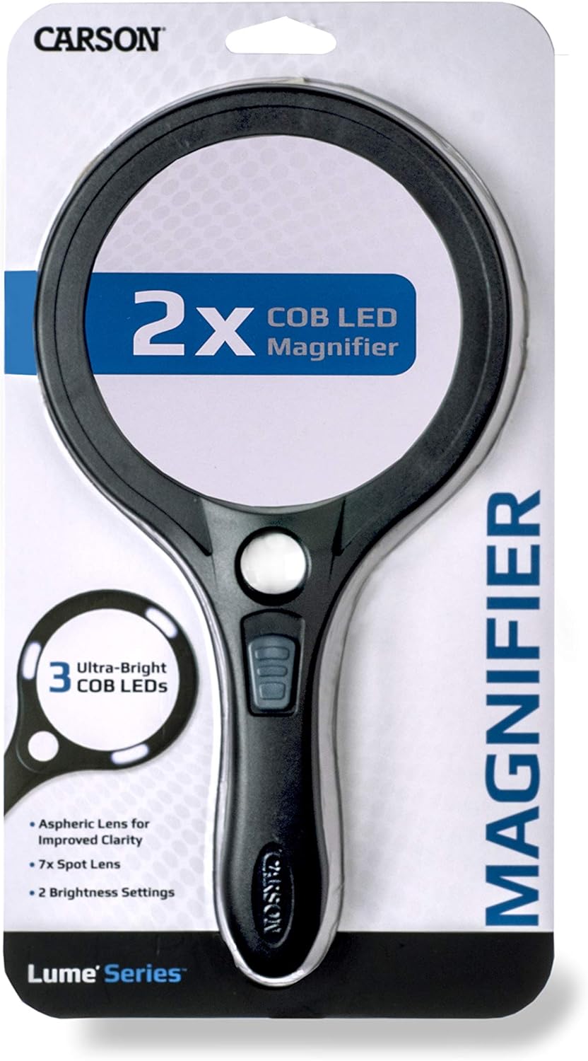 Review: I needed a portable magnifying glass to help me read schematics at work (which can have extremely small fonts). The Carson Lume Series COB LED 2x Aspheric Hand-Held Magnifier and 7x Spot Lens was a perfect choice to assist me with this daily part of my job.There are several things that I like/dislike about this item.PROSThe 2X Aspheric Lens is large and clear. I do not see any distortion (even at the edges) in the 2X lens and the 7X lens.The multiple LED lights are a must for most magnifying lens applications.This item has two different brightness settings for the 3 LED lights, which are properly spread out to illumination for the 2X lens.The selection of AAA batteries (versus an odd size) makes it very easy to keep the LED lights in operation.CONSThere is no included protective cloth case or sleeve, so you will have to get one to help keep the 2X lens from getting scratched up when not in use.The spot 7x lens diameter is a bitsmall for such a powerful magnification.None of the 3 LED lights are located near the 7X lens. You may have to angle the magnifier to point more of the emitted light to the area where you are reading with it with the 7X lens if there is not enough ambient light for you to read.Overall the Carson Lume Series COB LED 2x Aspheric Hand-Held Magnifier and 7x Spot Lens is a very solidly designed handheld magnifier. I give it a strong recommendation.
