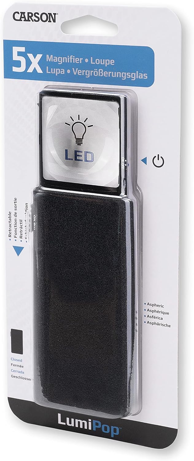 B00C672VN4, The Carson LumiPop is a compact, 5x power, slide-out pocket magnifier. It features a convenient pop-up design with a plastic snap-out case. This LumiPop boasts a 5x power aspheric lens perfect for studying the fine print with no blurring and little to no distortion. Its acrylic construction provides a shatterproof lens that is lightweight and easily carried in your pocket or handbag. Even in low light conditions, the LumiPop is equipped with an ultra-bright LED light and an easily accessible on/off switch for superior performance and crystal-clear optics. Batteries not included.