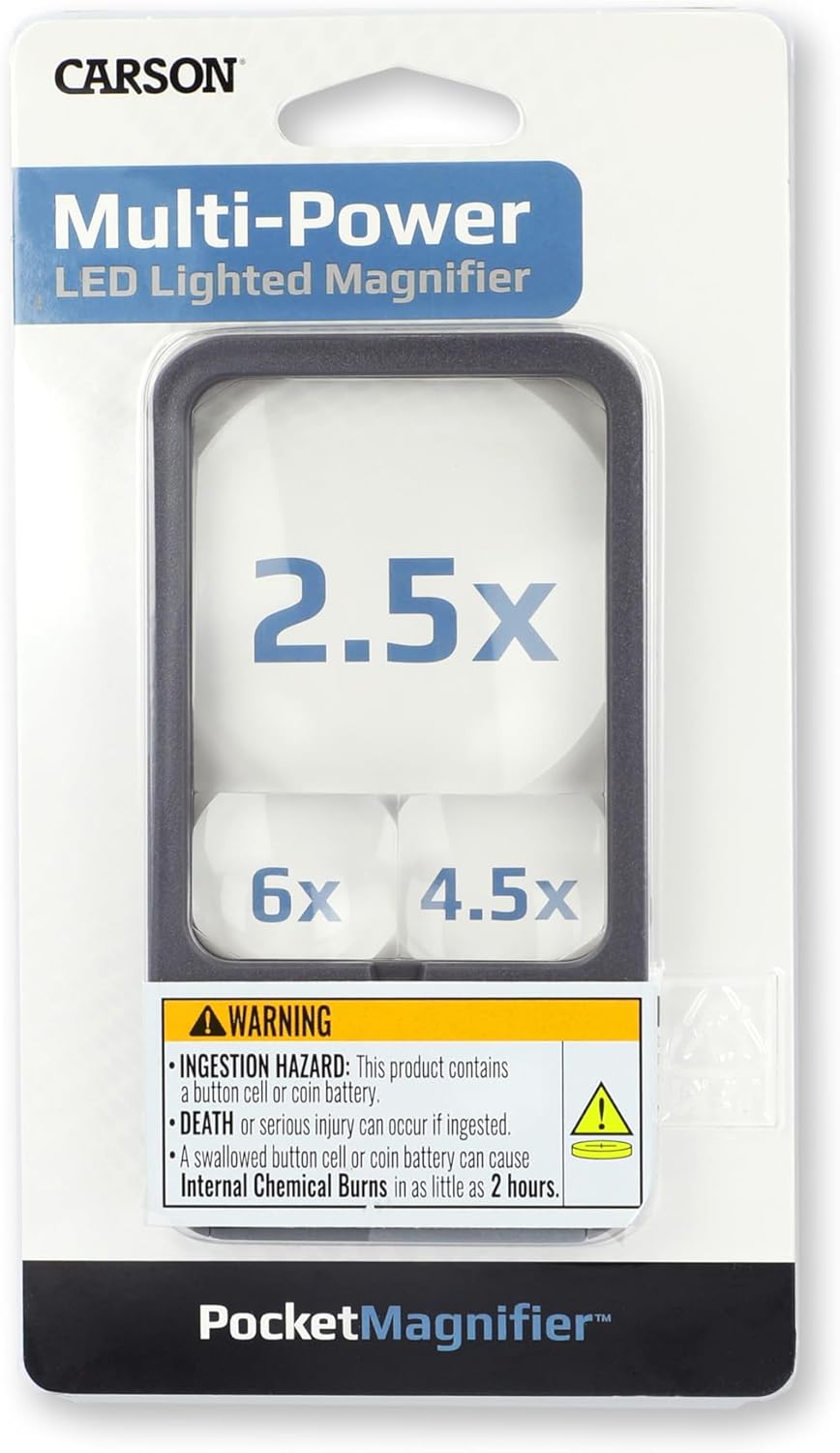 The Pocket Magnifier from Carson is a multi-power LED lighted magnifying glass that contains 3 built-in lenses that can be used for a variety of purposes. The larger, main lens on the pocket magnifier contains a 2.5x power magnification that is great for general reading. The smaller built-in acrylic lenses offer varying magnifications of 4.5x and 6x power that were intended for more precise inspection of examining intricate details on different subjects ranging from coins, stamps, film, currency, bugs, wildlife, etc.