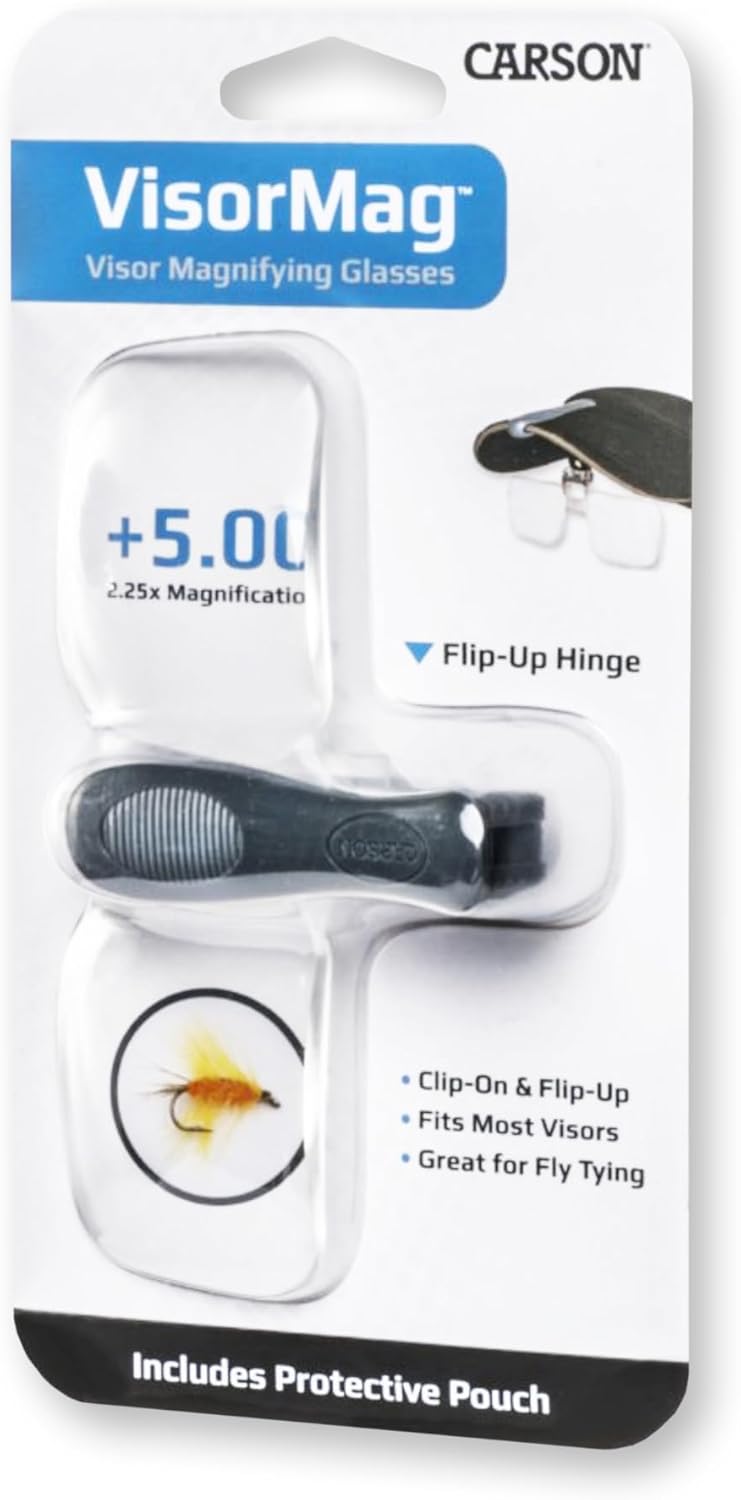 B0018SMMVS, The VisorMag from Carson is a set of clip-on, flip-up magnifying glasses that attach to the brim of most caps and hats. Perfect for fly-tying and all fly-fishing needs. Complete with protective soft-pouch, its crystal clear acrylic lenses give you a sharp, distortion-free view that allows you to see even the finest details with ease. Keep these clip-on Magnifying lenses in your tackle box so you will always have them ready. The VisorMag magnifying lenses are available in 3 different magnifications. The VM-10 model has a 1.75x magnification which is equivalent ot +3.00 diopters. The…, 4.5,