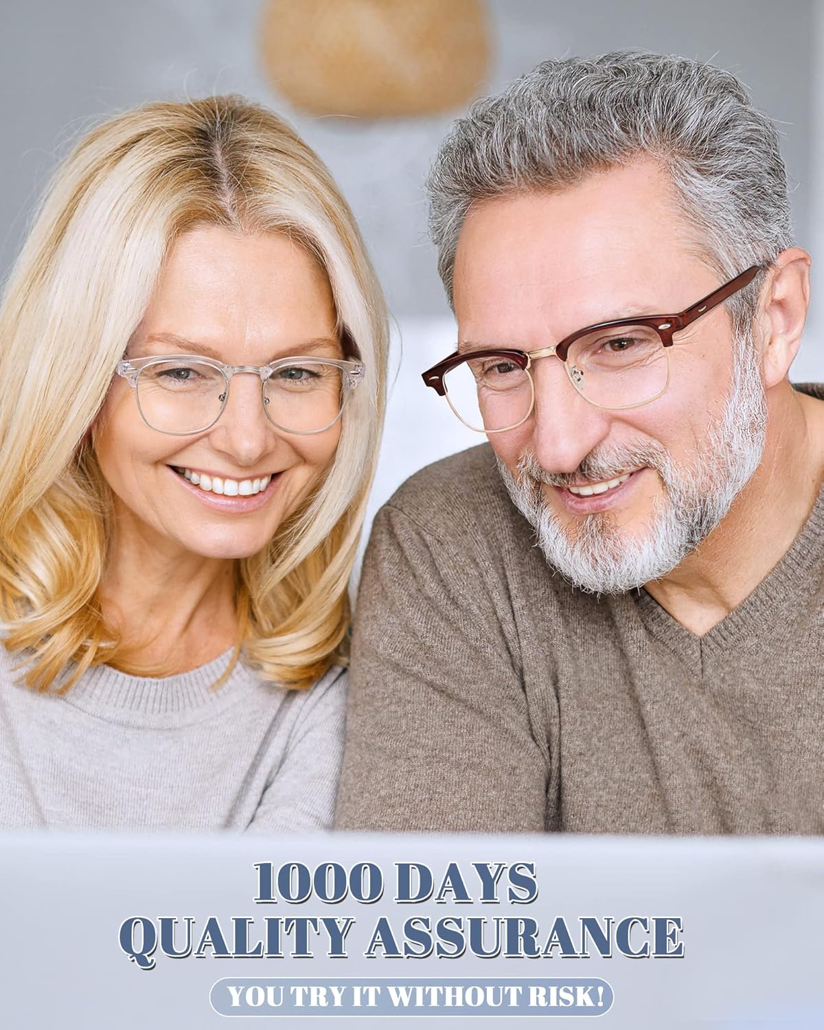 Review: Updated Review – December 2024While the styling, blue light feature, and price are great, I experienced durability issues. Both pairs I purchased broke over Christmas, just a month after my original review. They snapped at the left temple near the hinge, despite normal handling.Unless I’m able to get them exchanged, I don’t plan to repurchase due to the product’s quality concerns.Original Review: November 2024Bought this several months ago and I’m very happy with these reading glasses! The styling is fantastic—retro and semi-rimless, with a modern twist. I have received numerous compliments on their look and design. My favorite is the clear frame.The quality of the construction is top-notch. The lenses are clear, scratch-resistant, and provide great magnification. I also appreciate the ergonomic design with the silicone nose pads—very comfortable and lightweight, so no pressure on my nose during long reading sessions. The other thing I love is that the temple arms are long enough to go over my ears… which has been a challenge for me in adulthood. I normally have to request longer temple arms.What really surprised me was discovering the blue light blocking functionality. I didn’t realize these glasses had that feature until I received them, but it’s a game-changer! I spend a lot of time on screens, and I’ve noticed less eye strain and fewer headaches since using these. I sleep better, too, since the blue light blocking reduces eye fatigue from digital devices.For the price, you get 3 pairs of glasses, each in its own PU leather case, so you can keep them wherever you read. I think these are a great value for anyone looking for stylish, functional reading glasses that also offer extra protection against digital strain.Would definitely buy again and highly recommend to anyone in the market for new readers!